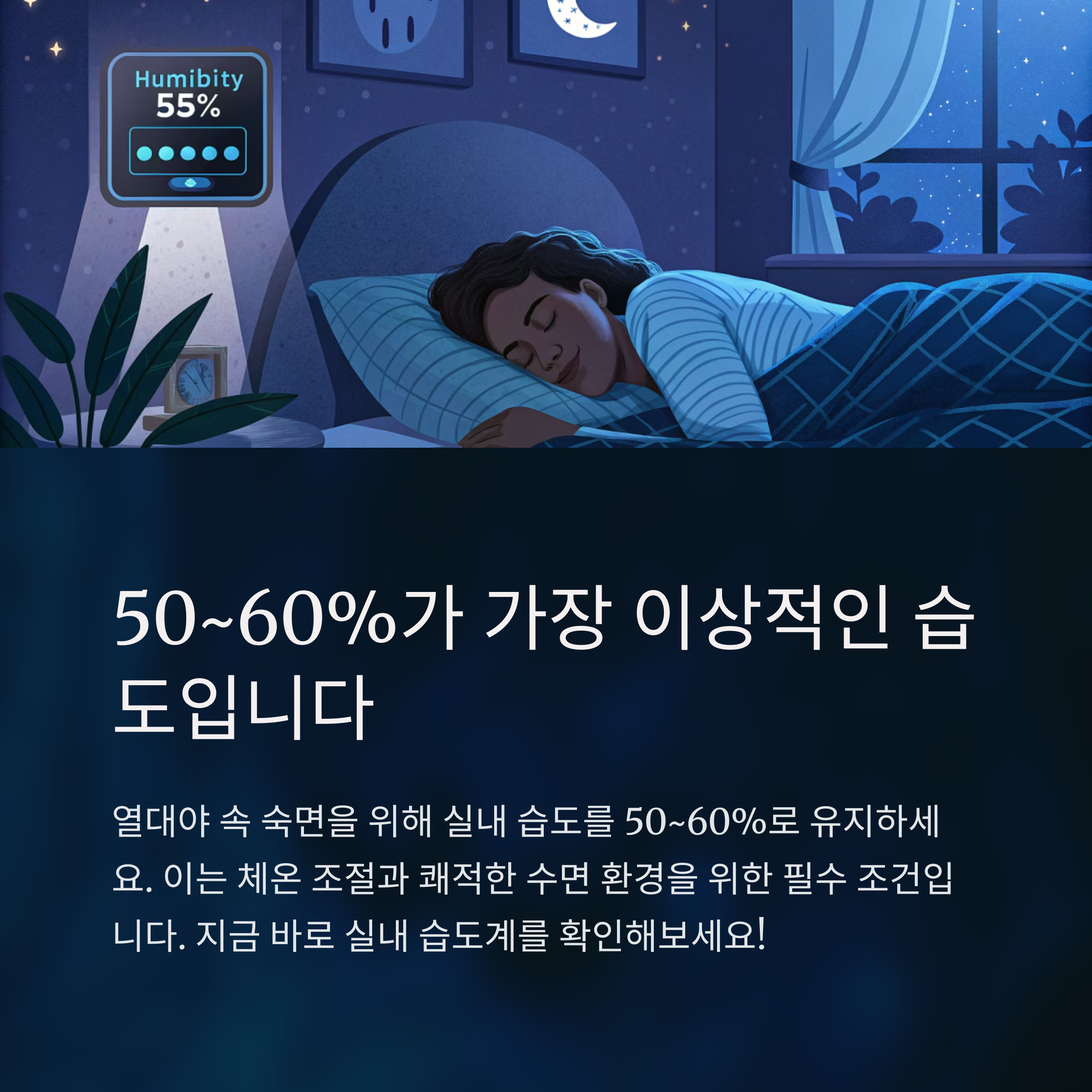 열대야가 기승을 부릴수록 수면 환경 조성의 중요성은 커집니다. 실내 습도를 50%~60%로 유지하는 것은 여름밤 숙면을 위한 가장 기본이자 필수적인 조건입니다. 땀이 잘 증발하며 체온이 자연스럽게 내려가는 이 수치는 수면의 질을 높이고, 다음 날의 컨디션까지 좌우하게 됩니다. 지금 바로 실내 습도계를 확인해보세요.