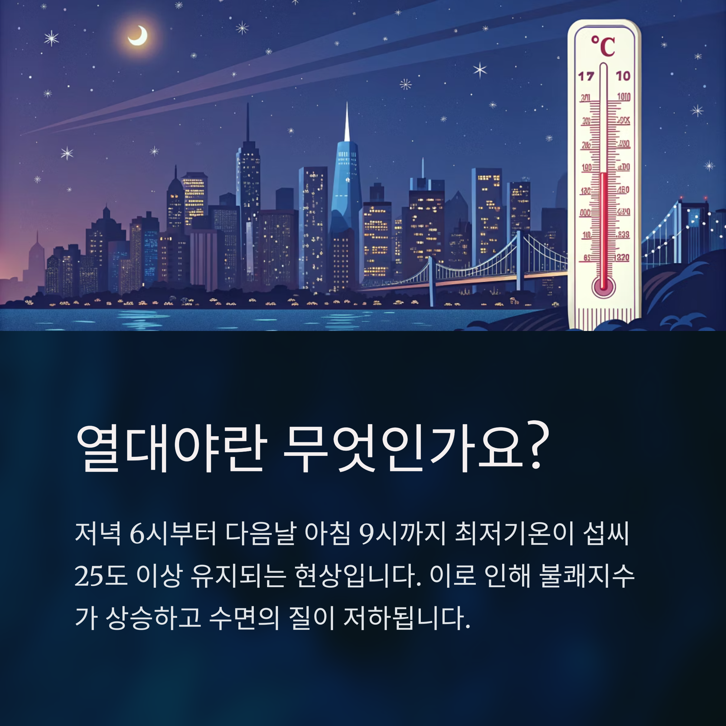 전날 저녁 6시부터 다음 날 아침 9시까지 최저기온이 섭씨 25도 이상으로 유지될 때를 열대야라고 합니다. 이 시기에는 낮 동안 축적된 열이 식지 않아, 밤새 실내 온도와 습도가 높게 유지되어 불쾌지수가 상승하게 됩니다. 이로 인해 수면의 질이 저하되고 만성 피로로 이어질 수 있습니다.