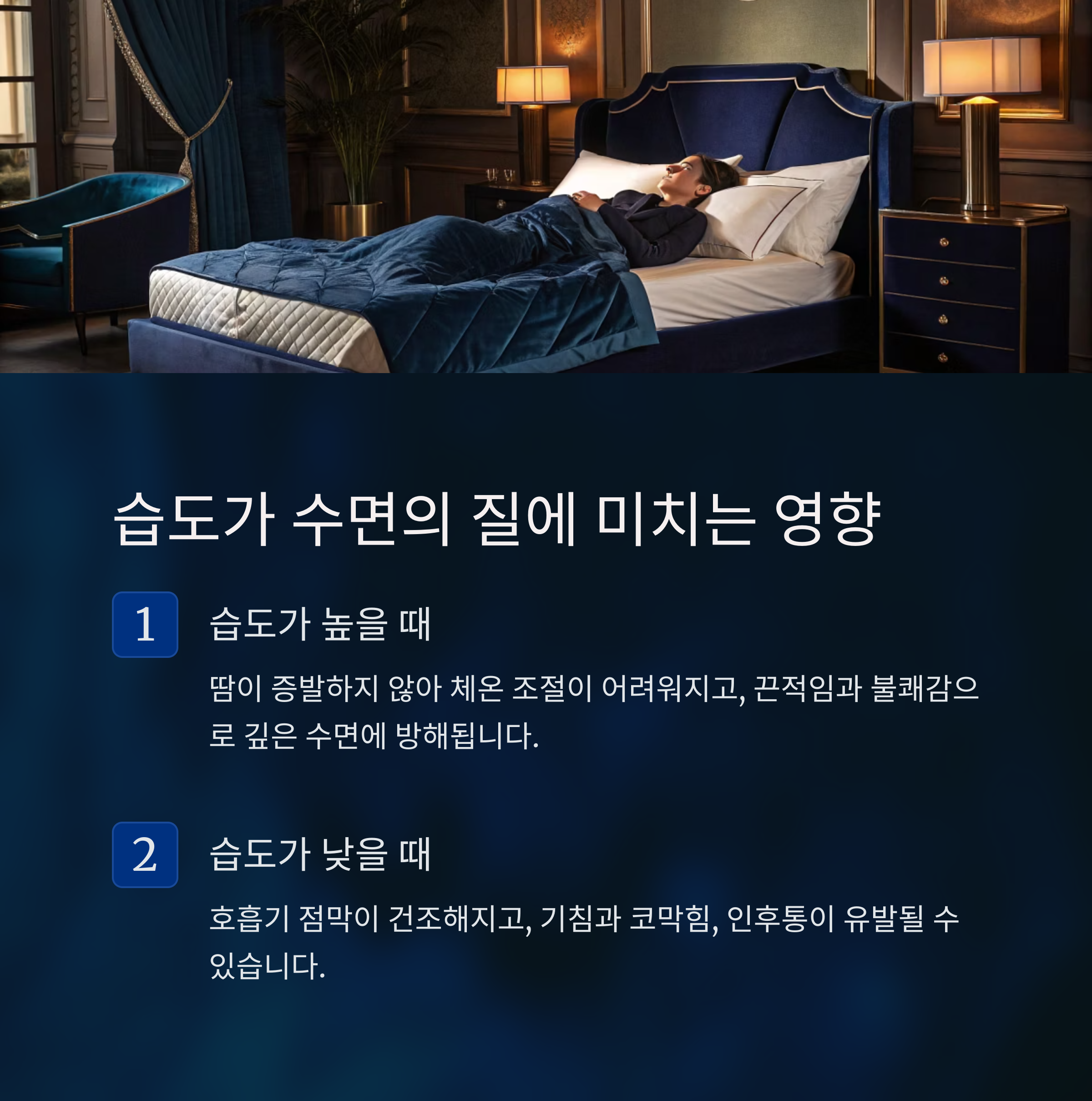 습도가 높으면 땀이 증발하지 않아 체온 조절이 어려워지고, 끈적임과 불쾌감으로 깊은 수면에 방해가 됩니다. 반대로 습도가 너무 낮으면 호흡기 점막이 건조해지고, 기침과 코막힘, 인후통이 유발될 수 있습니다. 특히 어린이나 노약자의 경우 이러한 변화에 더 민감하게 반응할 수 있습니다.