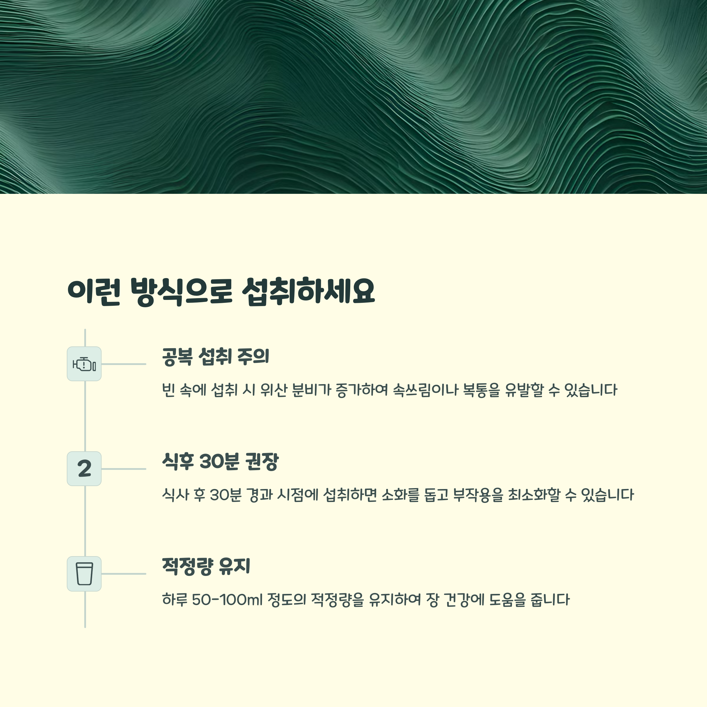 | 공복 섭취 주의사항 | 위산 과다 시 자극이 될 수 있어 주의가 필요합니다. |