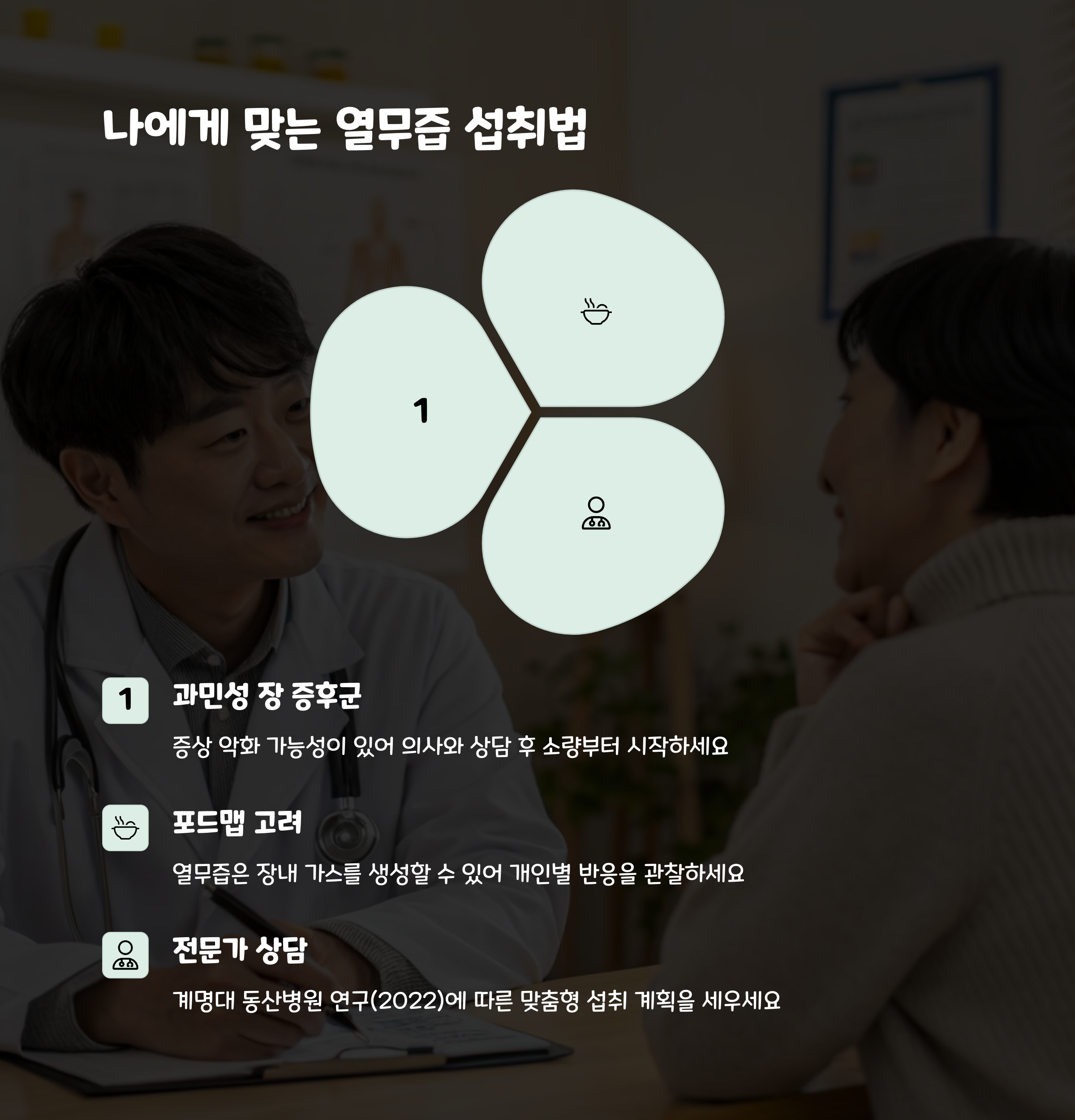 열무즙 섭취는 건강한 장을 유지하는 데 긍정적인 요소가 될 수 있습니다. 다만, 모든 사람에게 동일한 효과를 보장하지는 않습니다. 개인의 장 상태에 따라 결과가 달라질 수 있으므로, 무조건적인 공복 섭취보다는 자신의 건강 상태를 점검한 후 섭취하는 것이 바람직합니다. 2022년 계명대 동산병원 연구에서도 포드맵 제한 식단을 유지한 그룹의 장 트러블 발생률이 낮았다는 점은 중요한 시사점을 줍니다. 따라서 열무즙 섭취 시에도 개인별 맞춤형 식습관을 유지하는 것이 필요합니다.