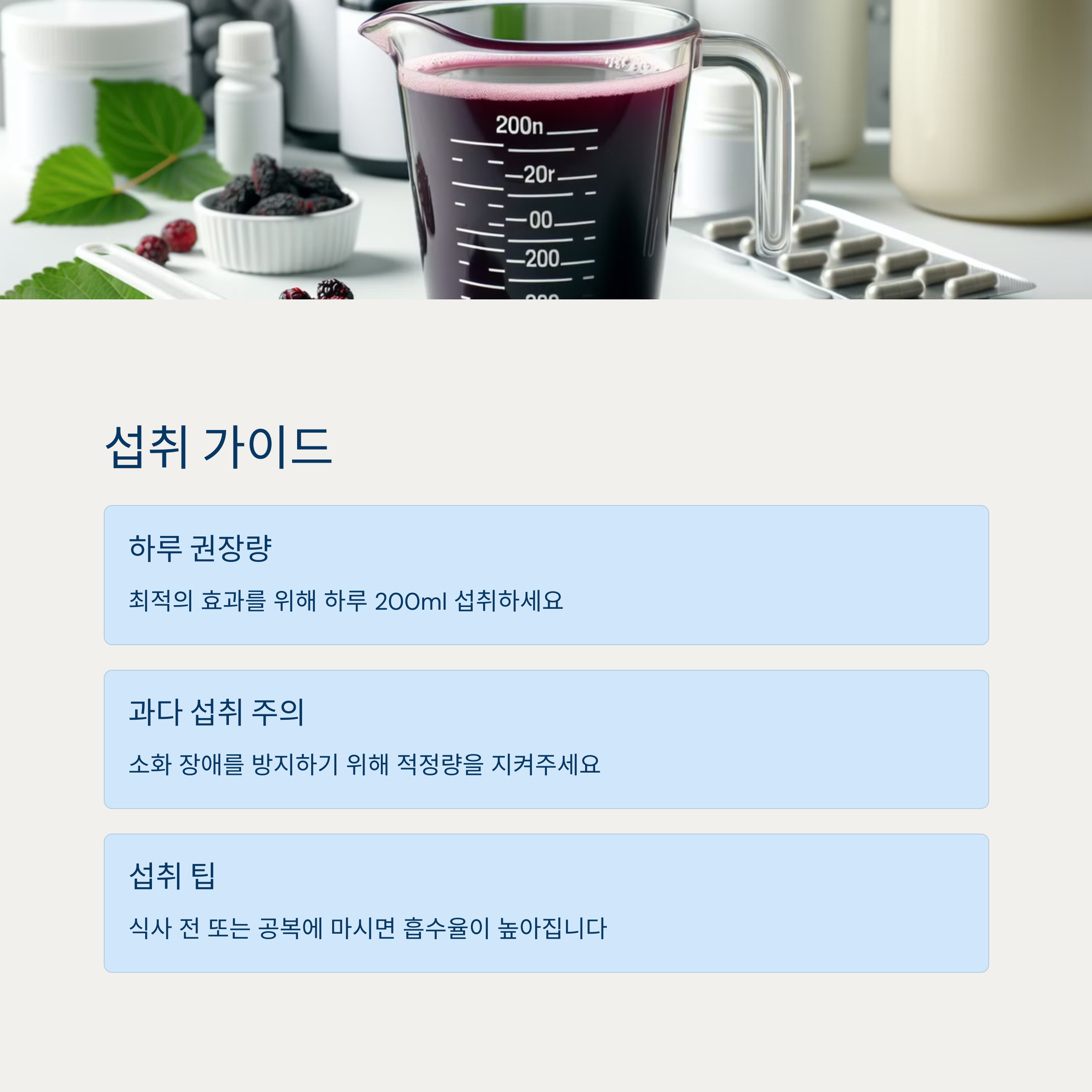아무리 몸에 좋다고 해도, 과하면 독이 될 수 있다는 말이 있잖아요? 오디즙도 적절히 섭취해야 그 효과를 톡톡히 볼 수 있습니다. 전문가들이 권장하는 하루 섭취량은 약 200ml 정도로, 보통 한 컵 가득 따르는 양이에요.
