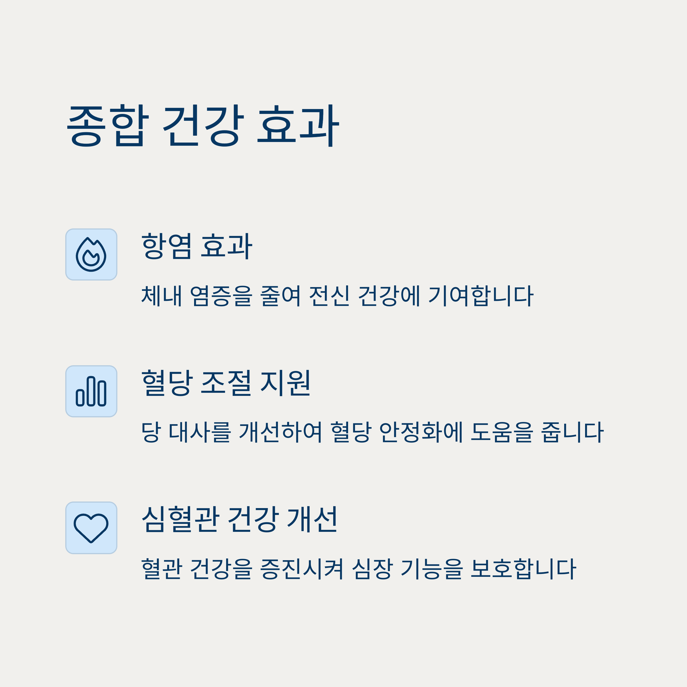 | 심혈관 건강 | 혈압 안정화 및 혈액순환 개선 |