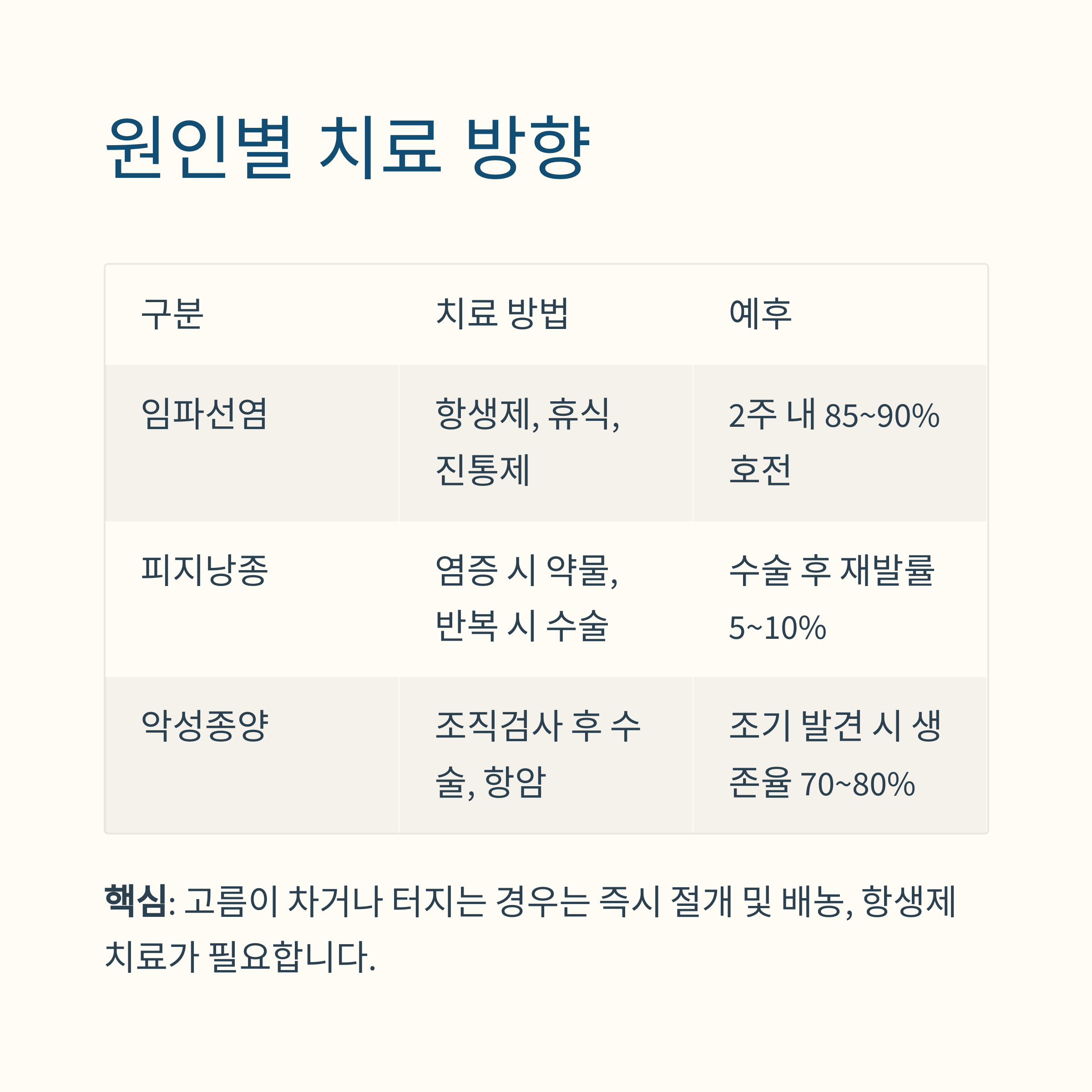 | 위험 | 크기 지속 증가 | 고름, 피부 터짐, 전신 증상 | 즉시 진료 필수 |