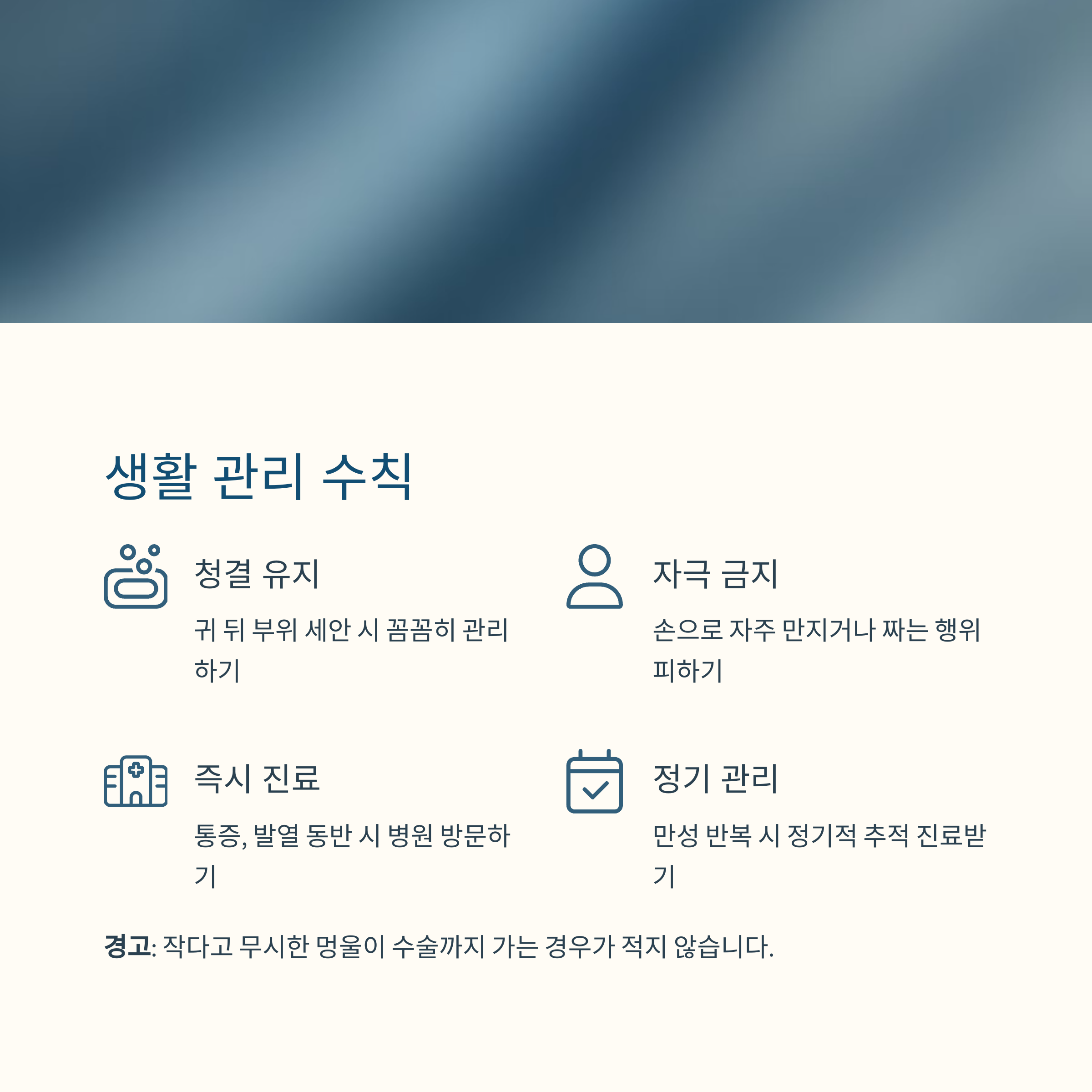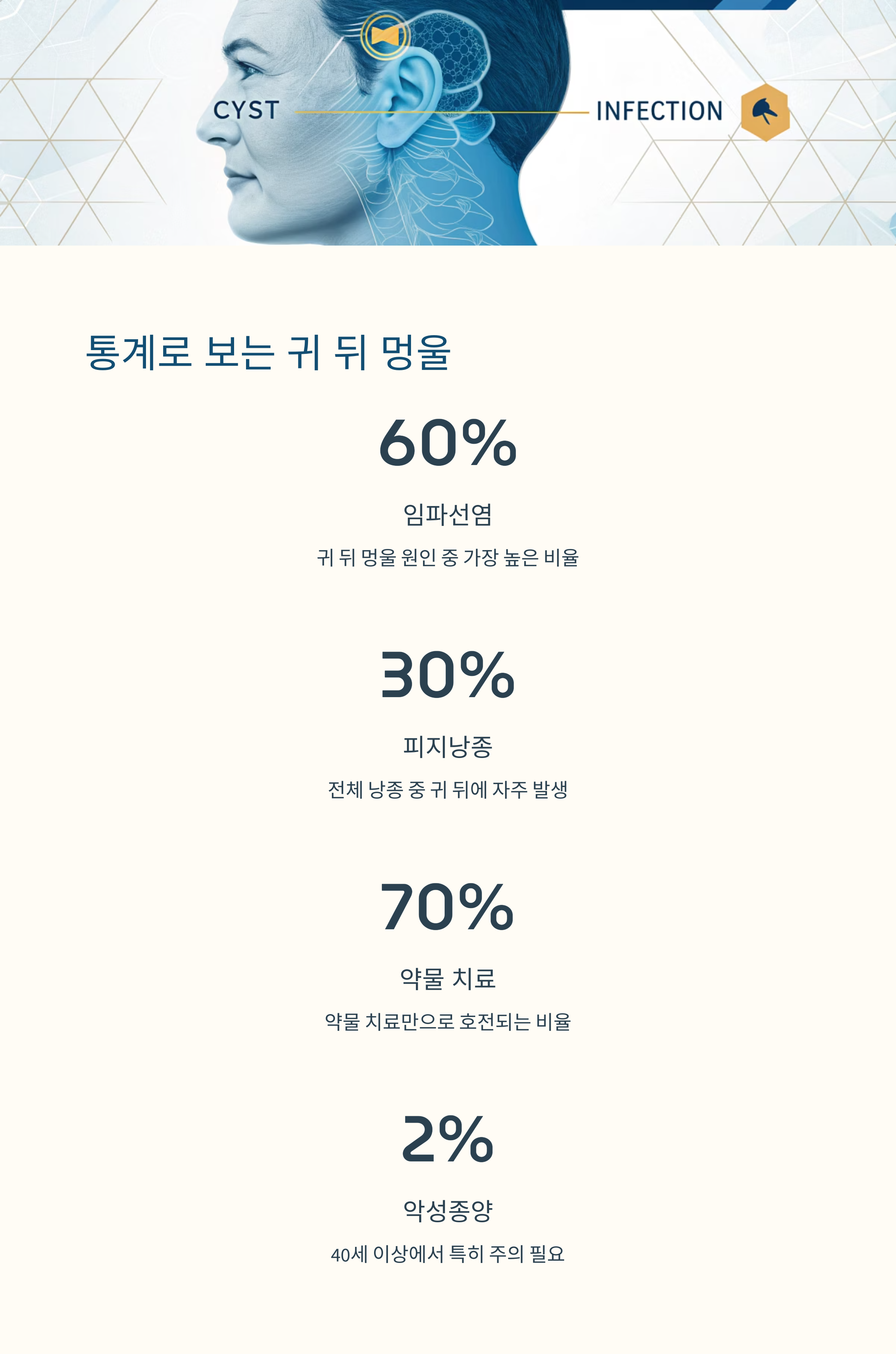 귀 뒤 멍울은 재발이 잦고, 불청결할 경우 염증으로 쉽게 악화됩니다.