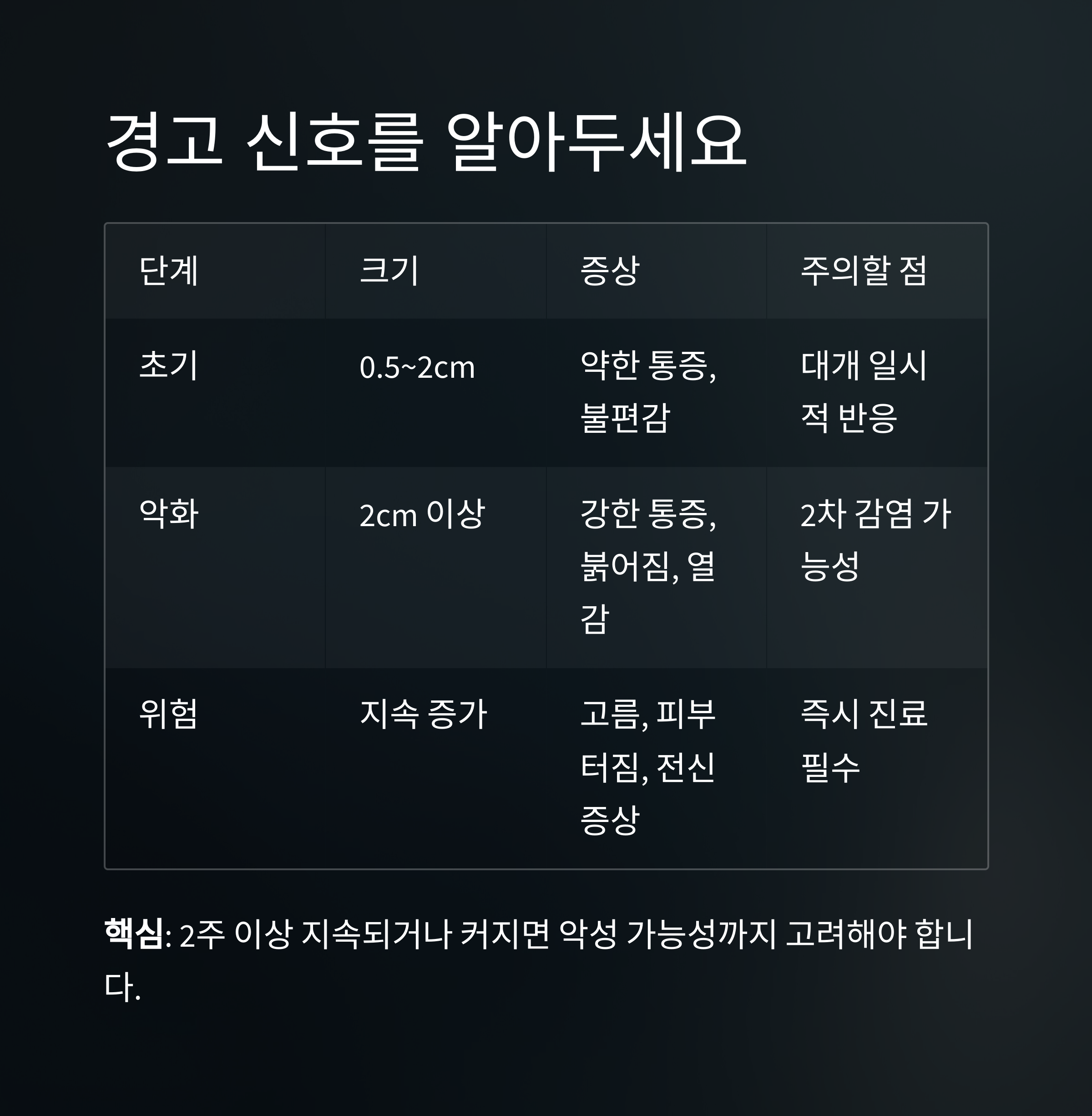 | 악화 | 2cm 이상 | 강한 통증, 붉어짐, 열감, 피로감 | 2차 감염 또는 종양 가능 |