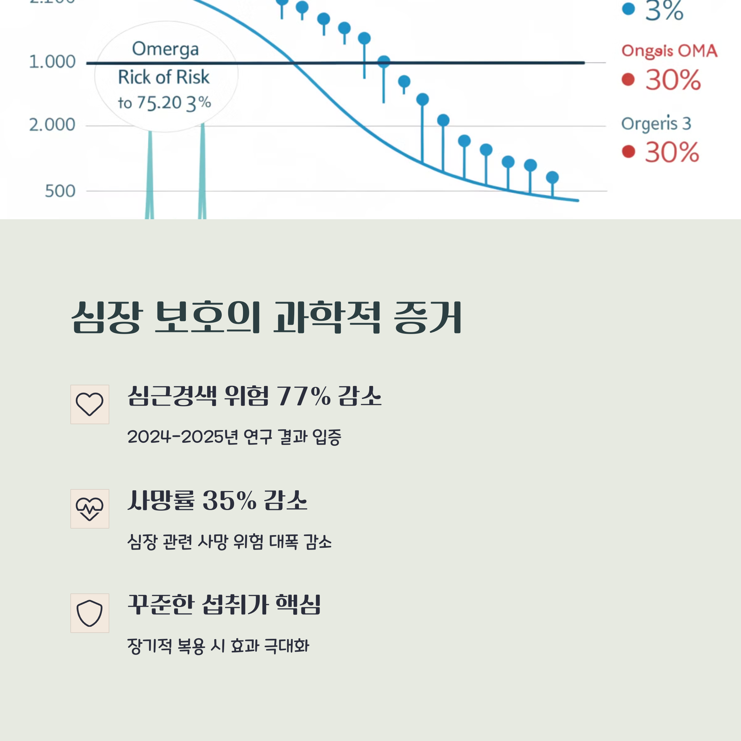 최근 2024년 메타분석 결과에 따르면, 오메가-3 지방산 보충제를 꾸준히 섭취하는 사람은 주요 심혈관 사건의 발생 위험이 평균 10% 감소하는 것으로 나타났습니다. 특히 심장 관련 사망률은 무려 35% 감소하는 통계가 확인되었으며, 이는 건강한 심혈관 기능 유지를 위해 오메가-3가 얼마나 중요한지를 입증하는 자료로 평가받고 있습니다. 더욱 주목할 점은, 혈중 중성지방 수치와 LDL 콜레스테롤 수치의 감소 효과가 함께 확인되었다는 것입니다. 이러한 이중 작용은 단순한 영양 보충을 넘어 예방적 치료적 접근으로 확장될 수 있음을 시사합니다.
