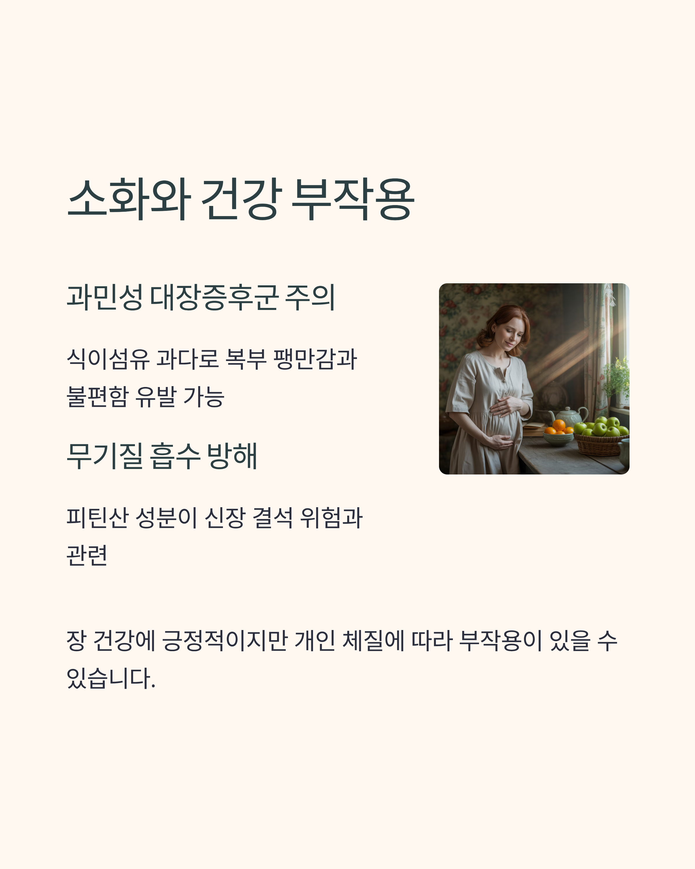 식이섬유가 많다는 것은 장 건강에 긍정적이지만, 과민성 대장 증후군을 가진 분들에겐 복부 팽만감과 불편함을 유발할 수 있습니다. 또한 귀리에 포함된 피틴산은 무기질 흡수를 방해해 신장 결석 위험과 관련 있다는 보고도 있습니다.