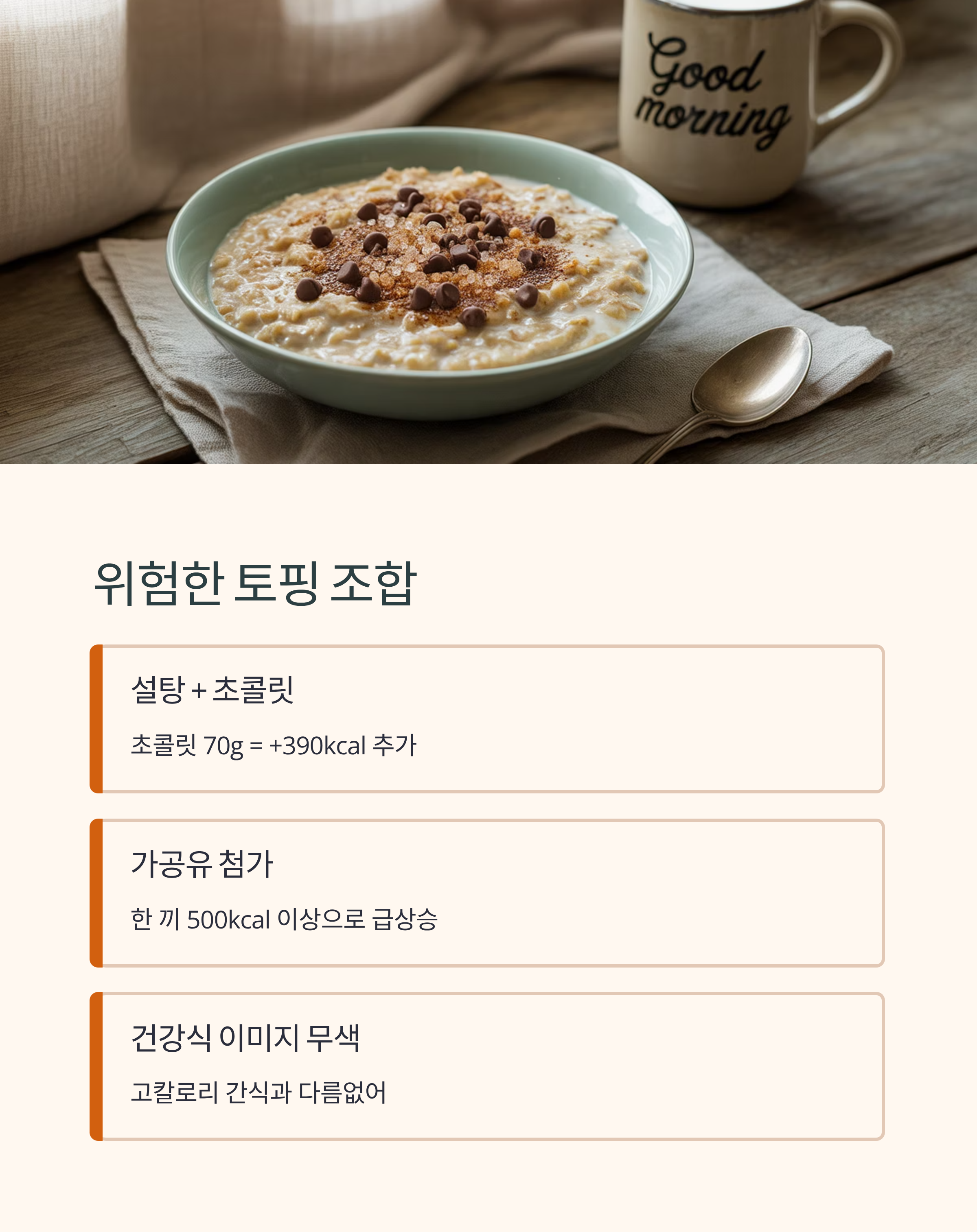 오트밀에 설탕, 초콜릿, 가공유를 넣으면 한 끼 열량이 급격히 상승합니다. 예를 들어 초콜릿 70g을 곁들이면 390kcal가 추가되어 단숨에 500kcal 이상이 됩니다. 결국 ‘건강식’이라는 이미지가 무색해지는 것이죠.
