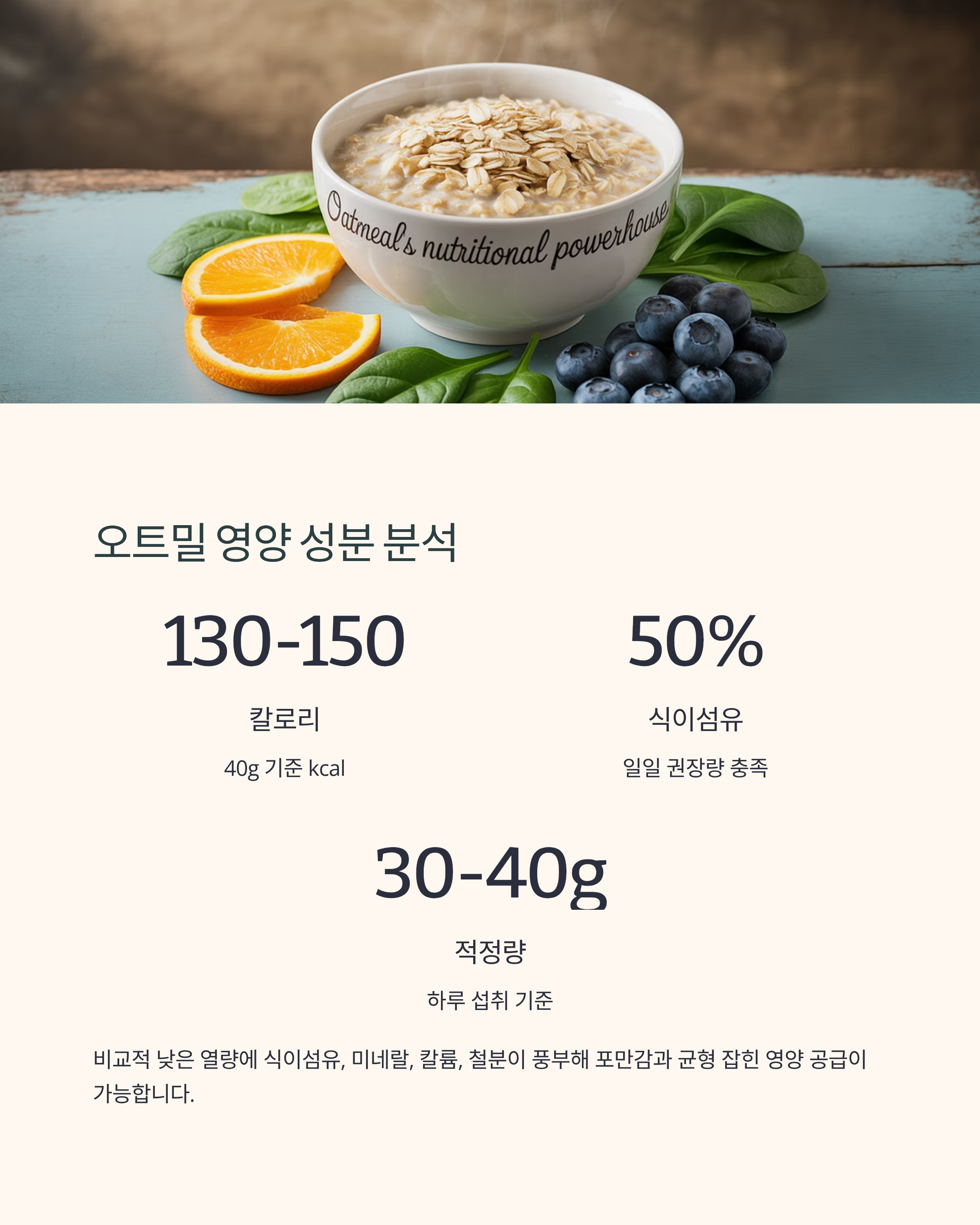 오트밀은 약 40g 기준 130kcal~150kcal 정도로 비교적 낮은 열량을 가집니다. 여기에 식이섬유, 미네랄, 칼륨, 철분까지 들어 있어 포만감을 높여주고 균형 잡힌 영양 공급에 유리합니다. 하루 30~40g만으로도 식이섬유 권장량의 절반 이상을 충족할 수 있다는 점이 특징입니다.
