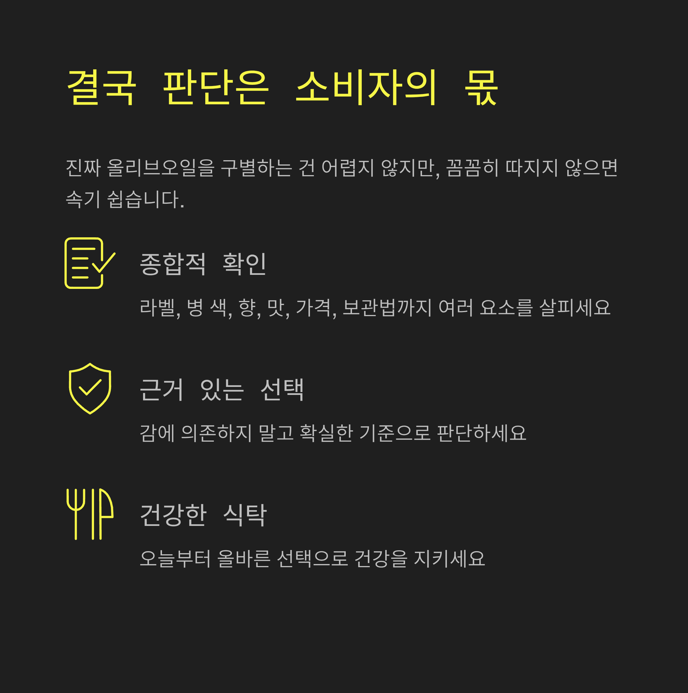 라벨, 병 색, 향, 맛, 가격, 보관법까지 여러 요소를 종합적으로 살피는 습관이 필요해요. 오늘부터는 감에 의존하지 말고, '근거 있는 선택'으로 건강한 식탁을 지켜보세요.