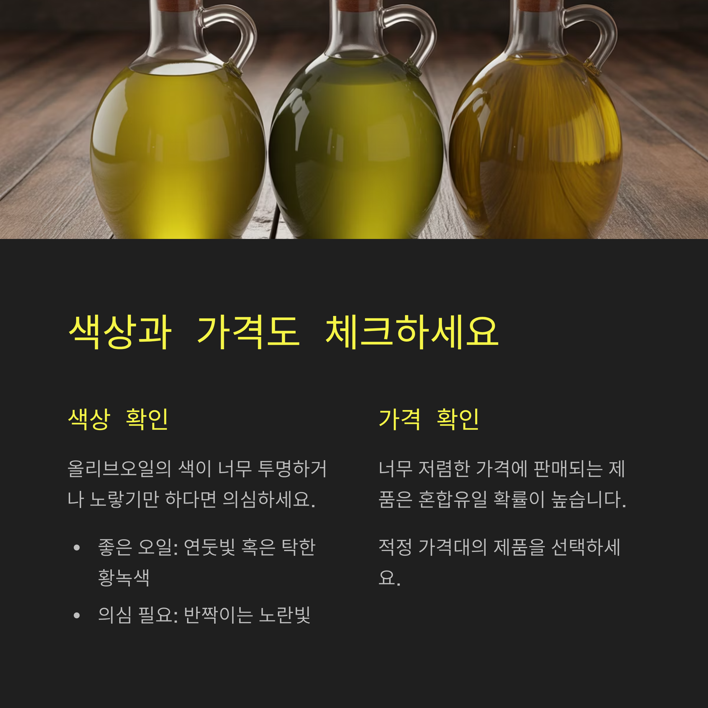 올리브오일의 색이 너무 투명하거나 노랗기만 하다면 의심하세요.