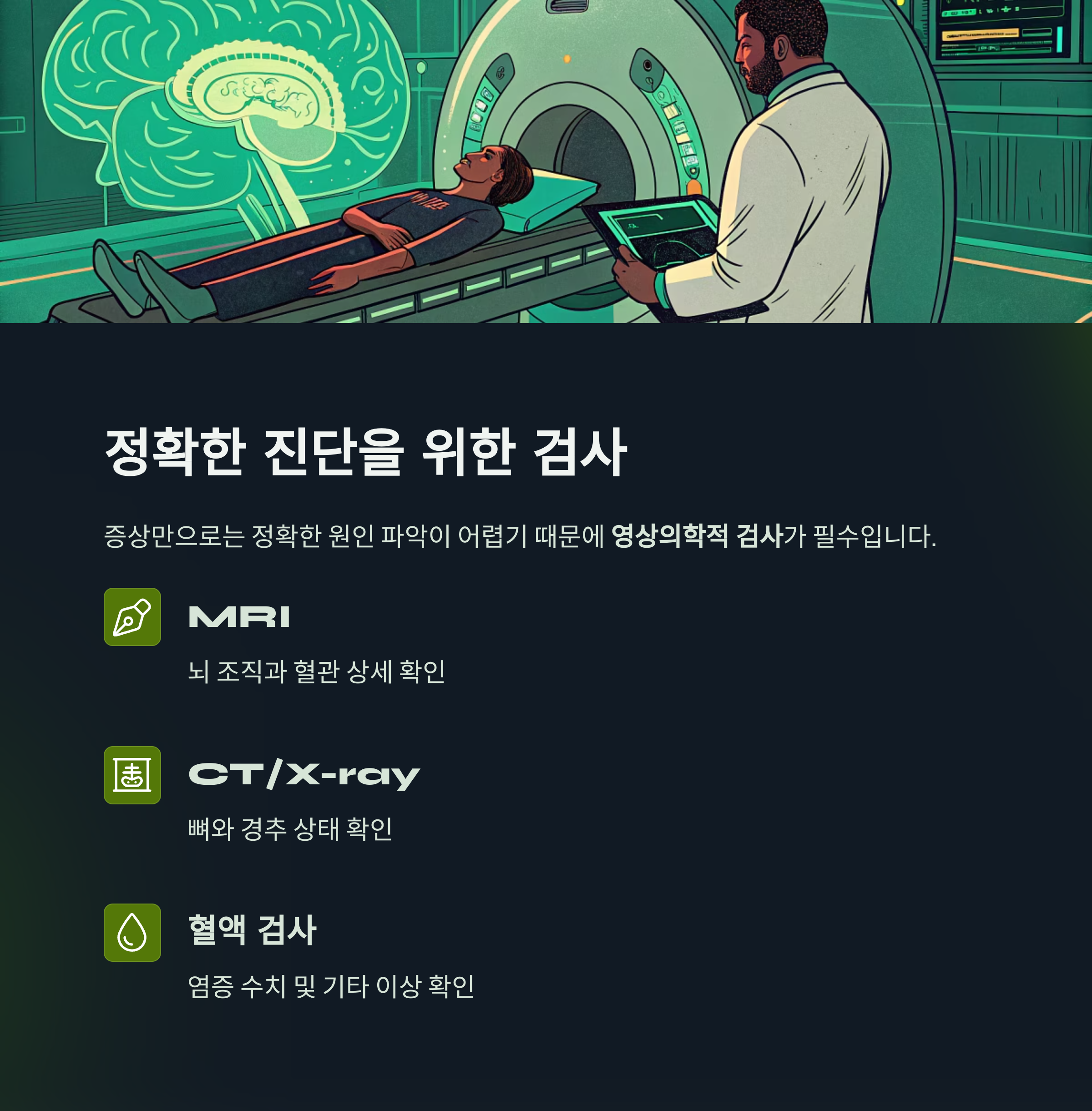 증상만으로는 정확한 원인 파악이 어렵기 때문에 영상의학적 검사가 필수입니다