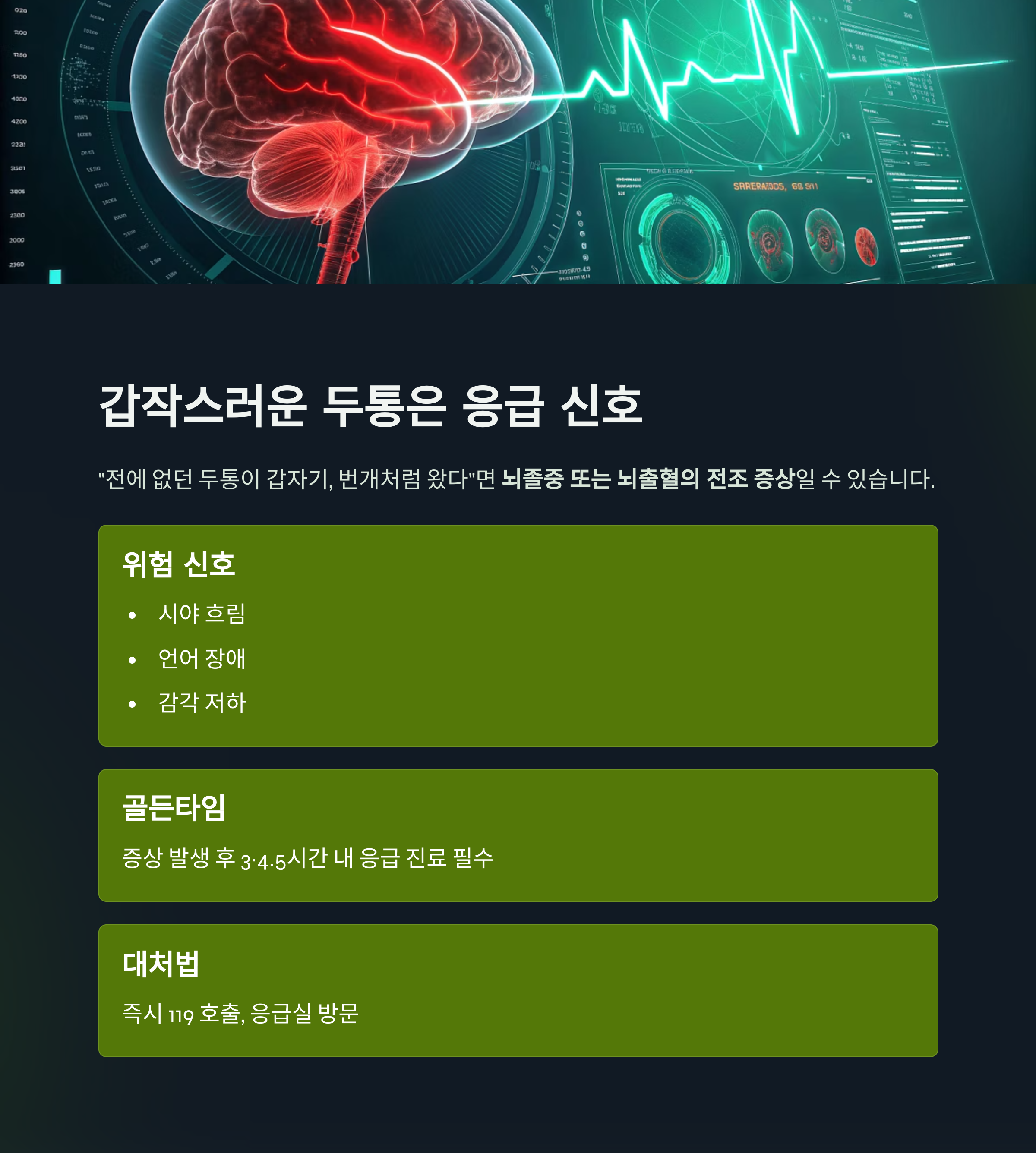 "전에 없던 두통이 갑자기, 번개처럼 왔다"면 뇌졸중 또는 뇌출혈의 전조 증상일 수 있습니다