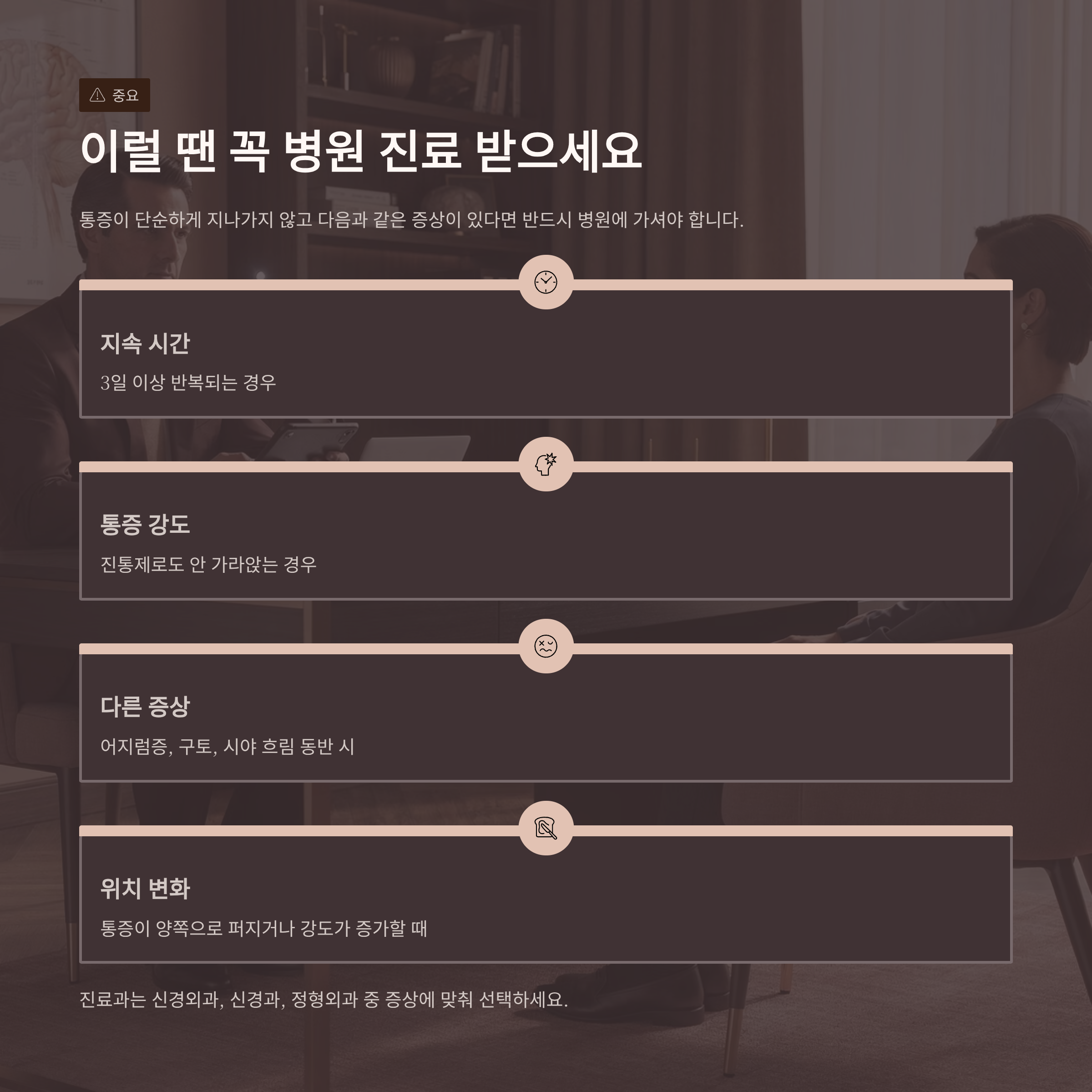 진료과는 신경외과, 신경과, 정형외과 중 증상에 맞춰 선택하세요.
