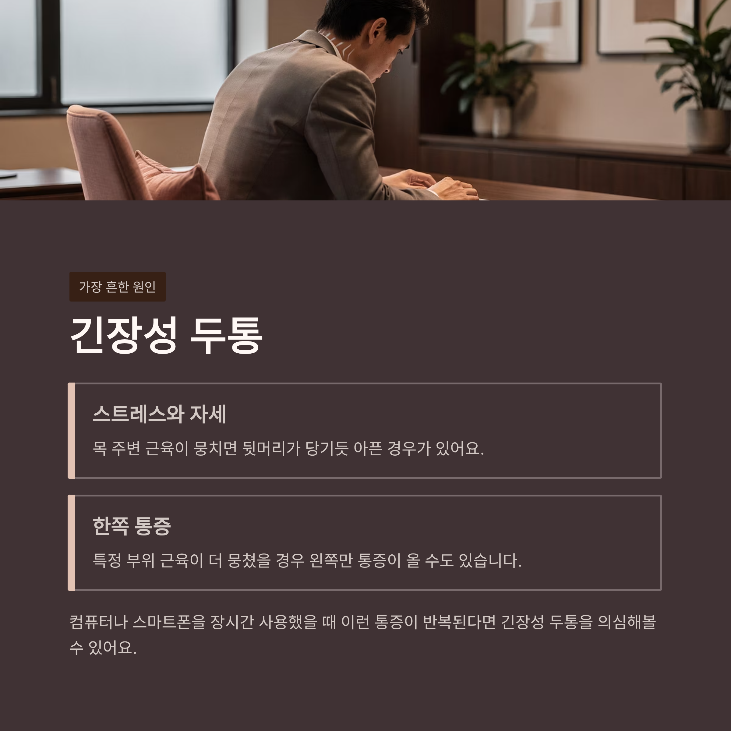신경을 눌러 머리 뒷부분, 특히 한쪽에 통증을 유발할 수 있어요.