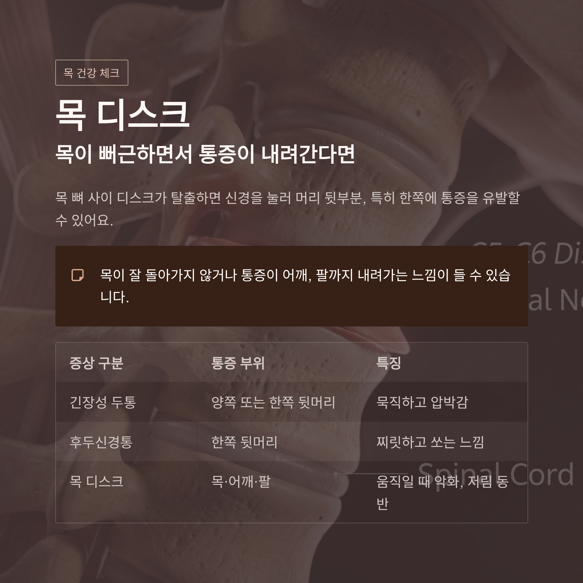 | 목 디스크 | 목~어깨~팔 | 움직일 때 악화, 저림 동반 |