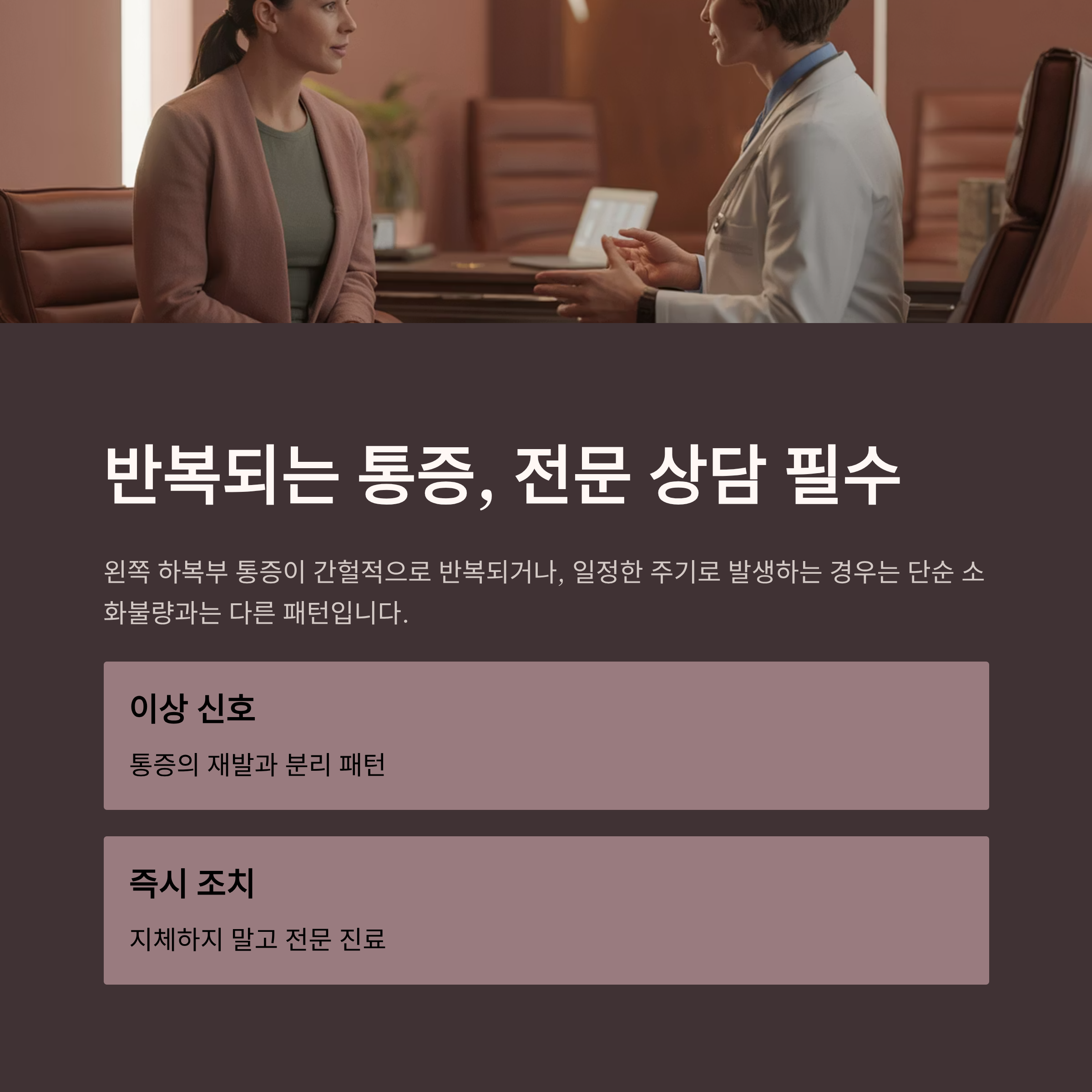 왼쪽 하복부 통증이 간헐적으로 반복되거나, 일정한 주기로 발생하는 경우는 단순 소화불량과는 다른 패턴입니다. 특히 "이상", "분리", "통증의 재발"과 같은 신호가 보인다면 지체하지 말고 전문 진료를 받는 것이 바람직합니다.