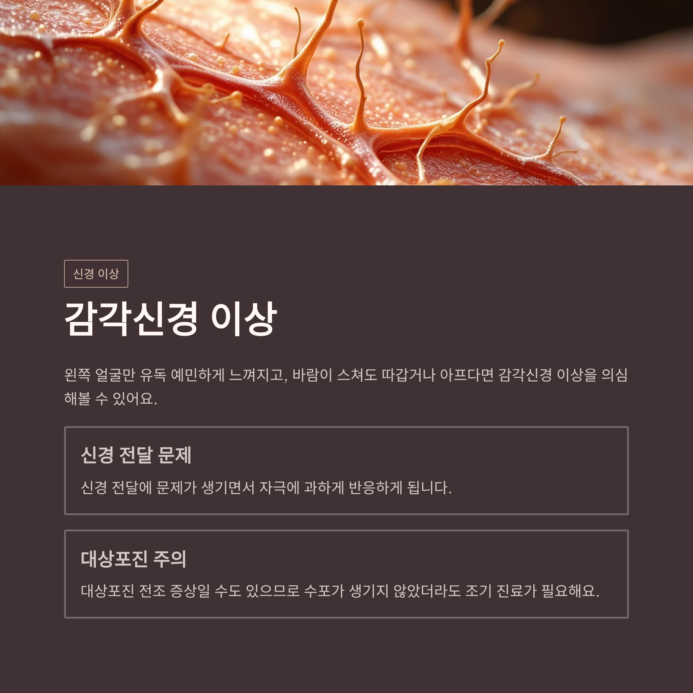 왼쪽 얼굴만 유독 예민하게 느껴지고, 바람이 스쳐도 따갑거나 아프다면 감각신경 이상을 의심해볼 수 있어요.