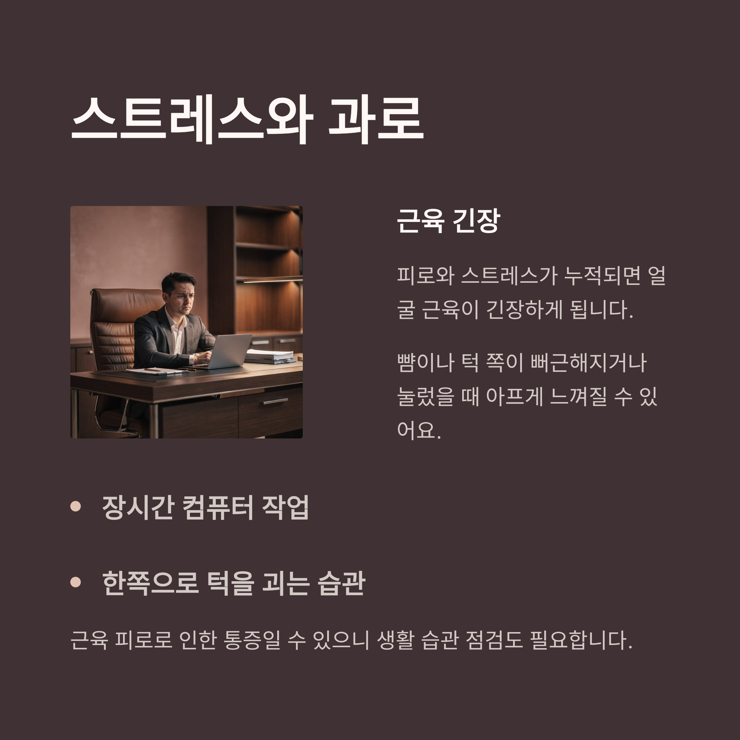 특히 장시간 컴퓨터 작업이나 한쪽으로 턱을 괴는 습관이 있다면, 근육 피로로 인한 통증일 수 있으니 생활 습관 점검도 필요합니다.