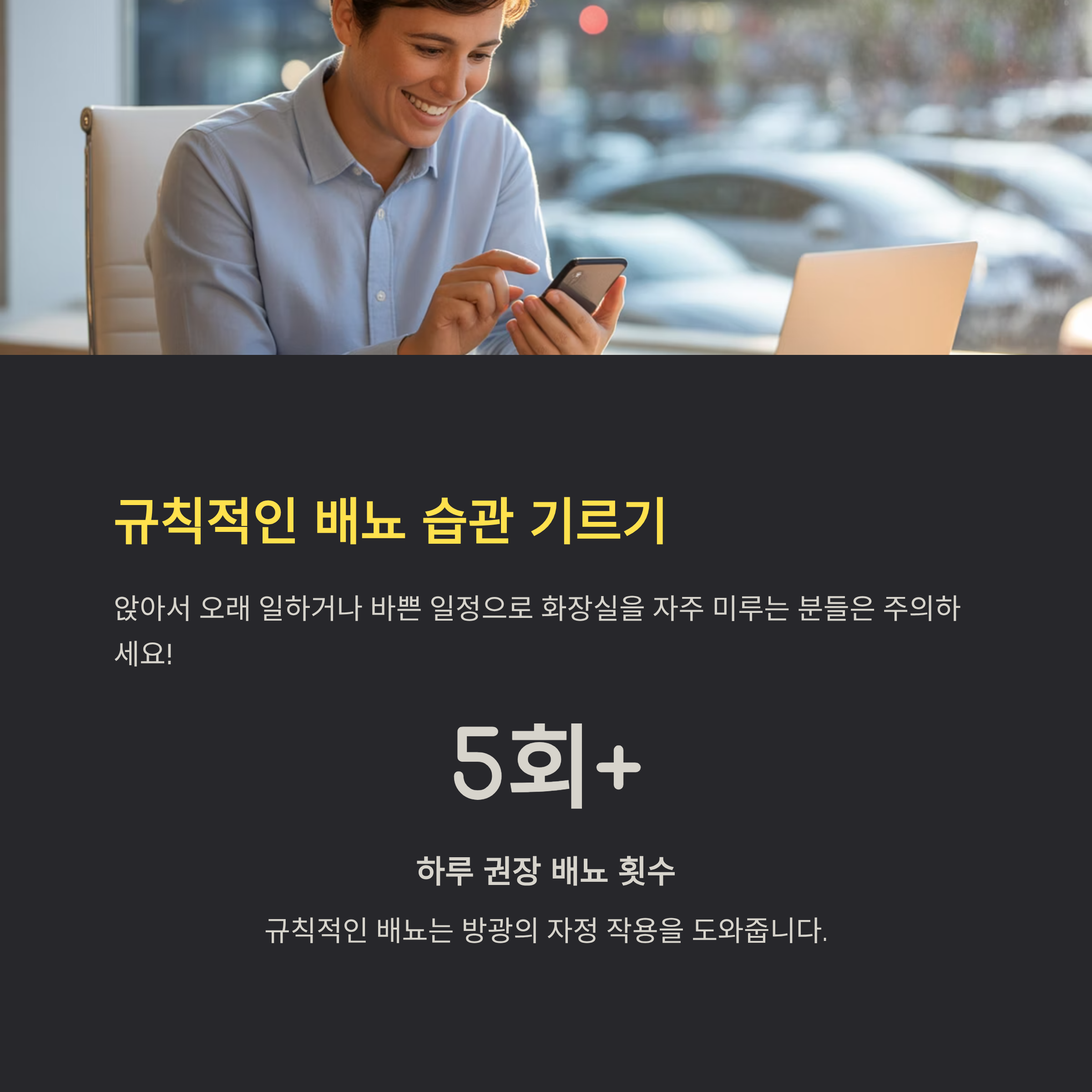 특히 앉아서 오래 일하는 분들, 바쁜 일정으로 화장실을 자주 미루는 분들은 주의해야 해요.