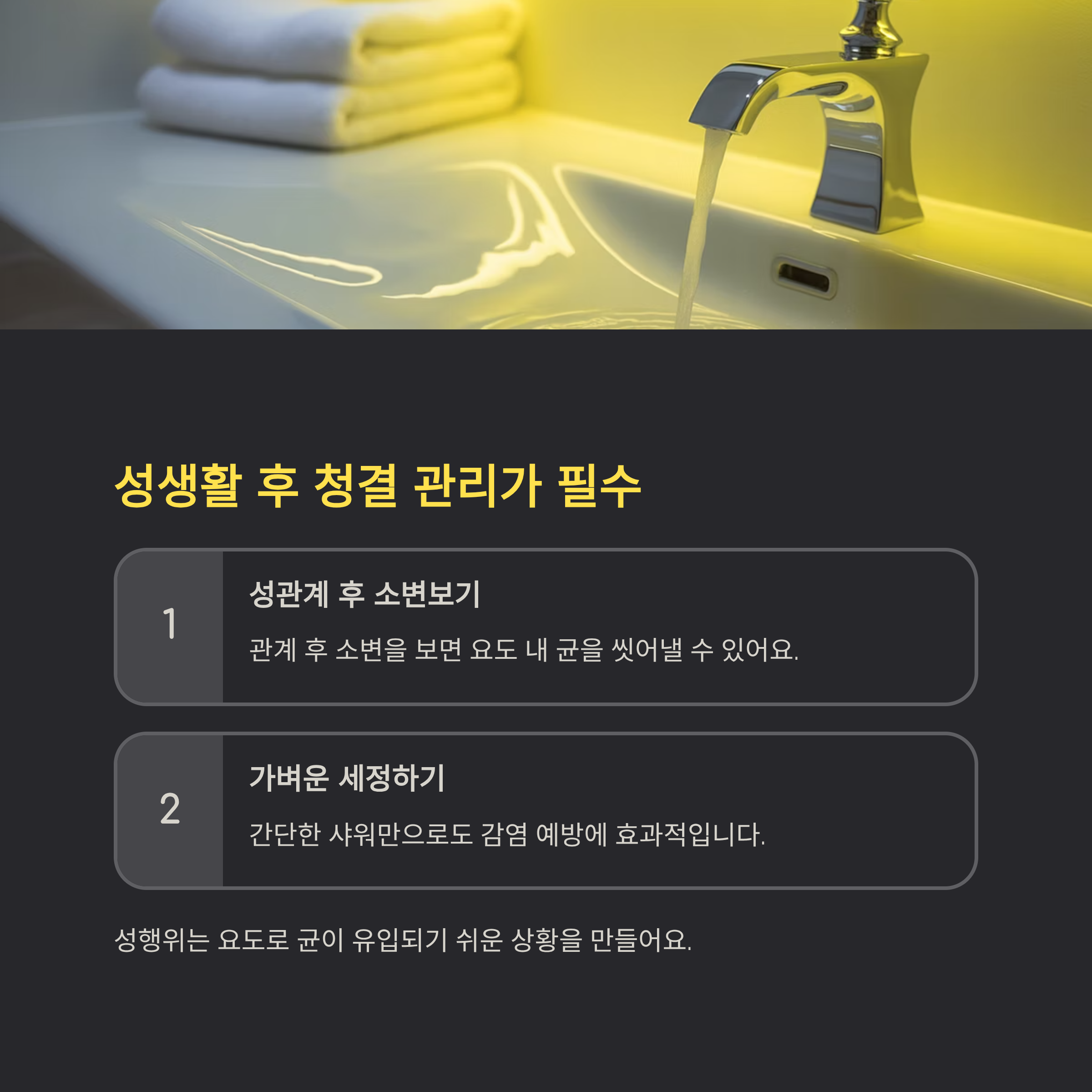 성관계 후 소변을 보지 않거나, 세정 없이 방치하면 요로감염 위험이 높아집니다.