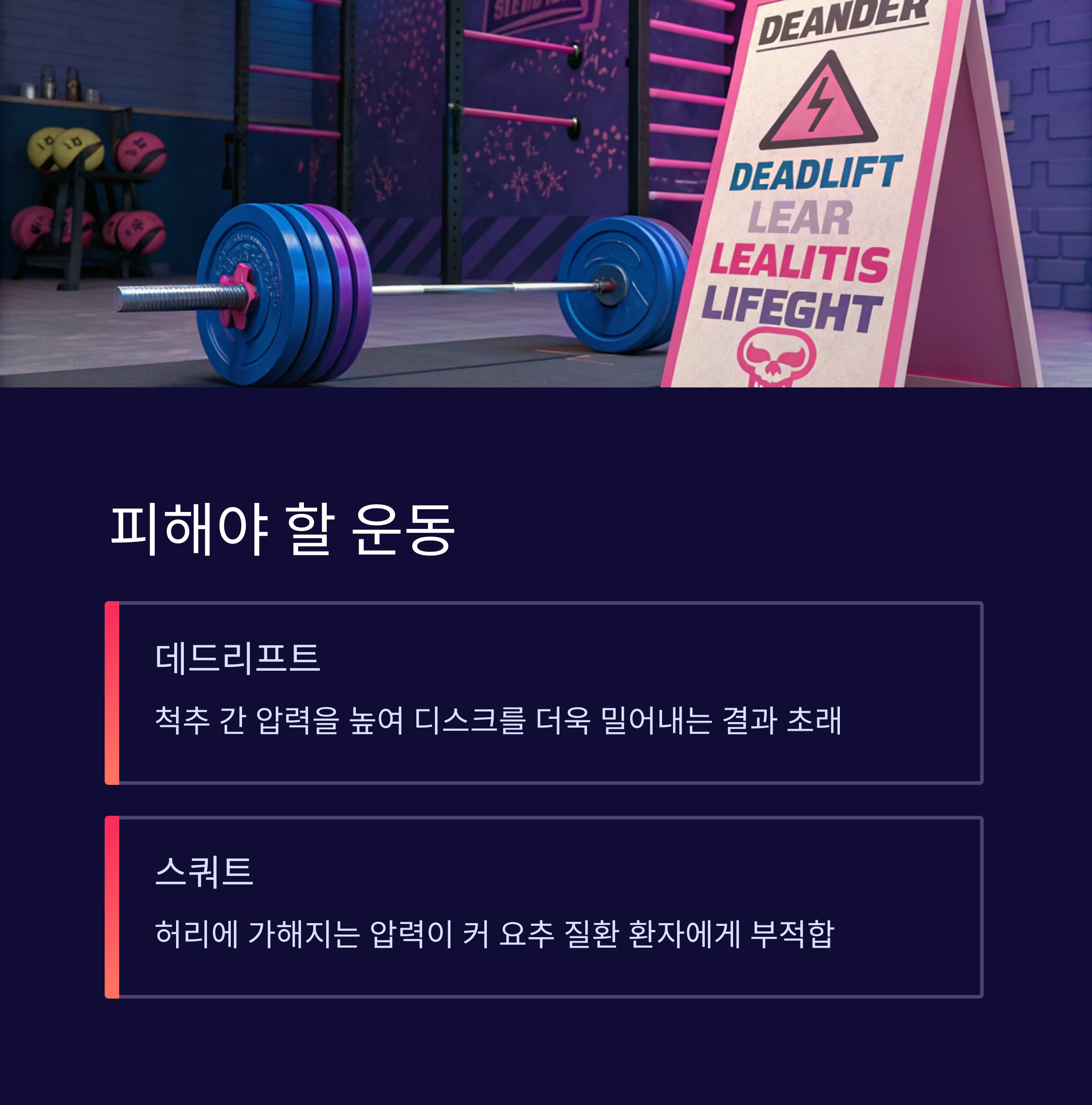 | 데드리프트 | 척추 압력 증가로 디스크 탈출 위험 증가 |