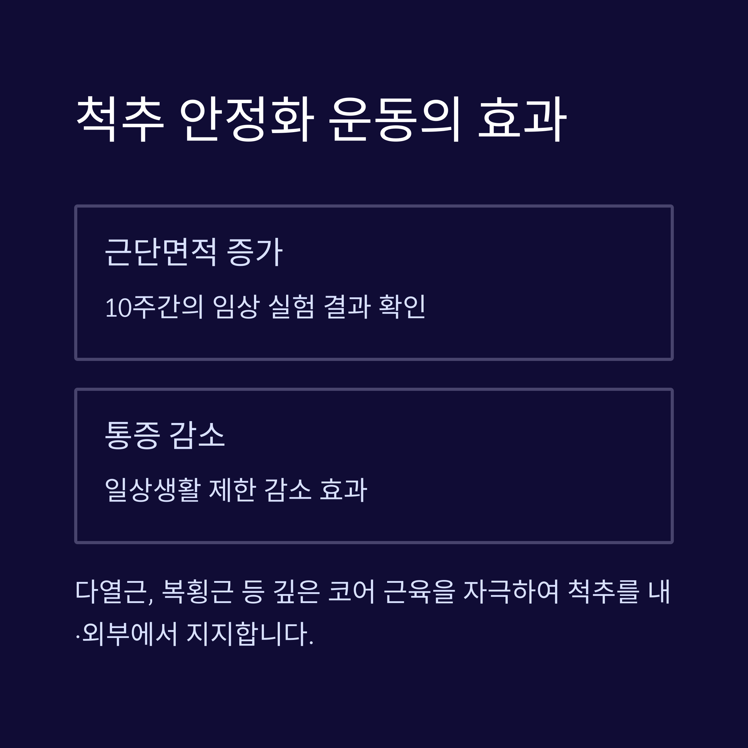 | 척추 안정화 운동 | 완화 | 10주 후 통증·기능 개선, 근력 증가, 근단면적 확대 |