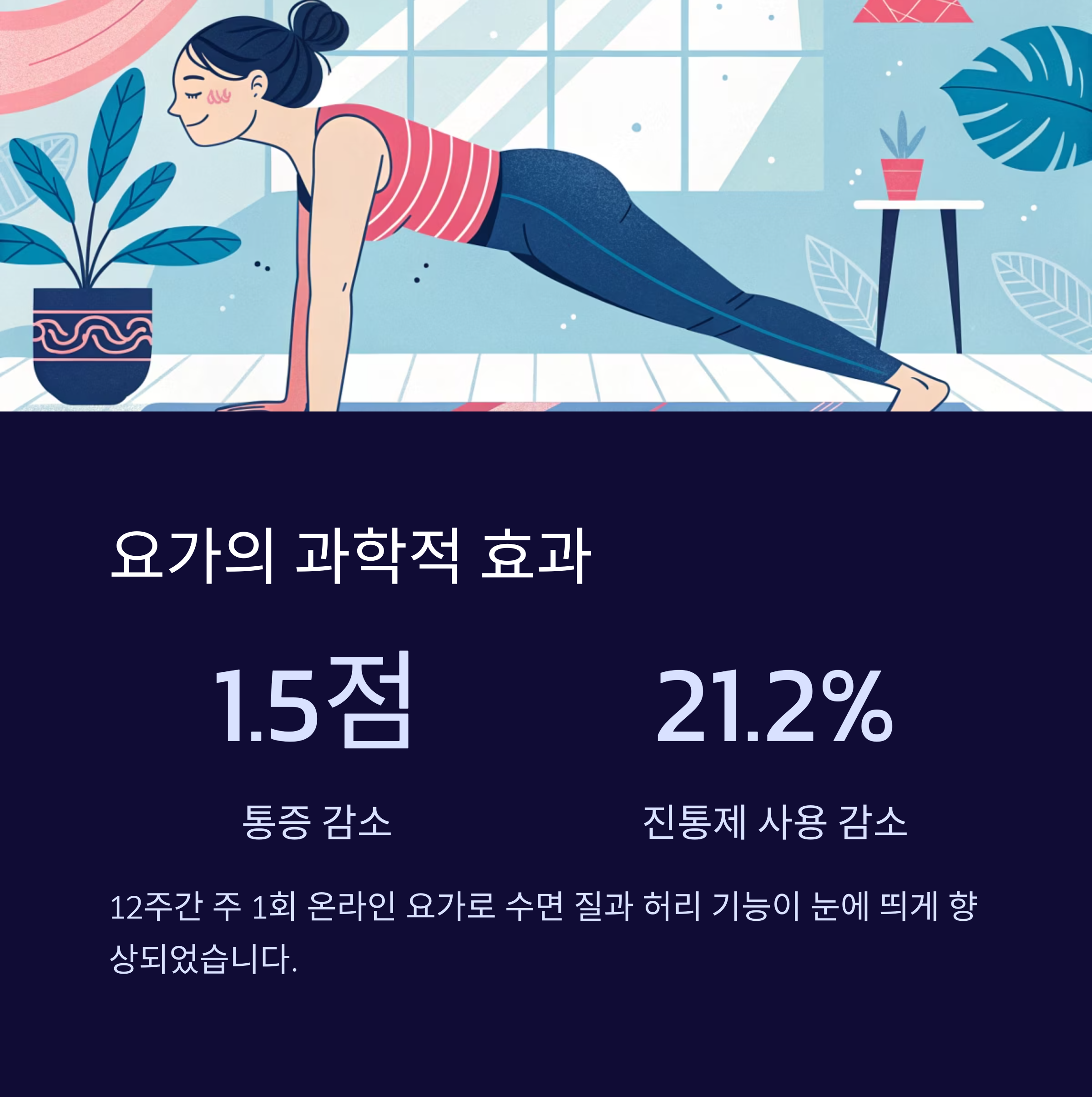 진통제 사용률도 21.2% 감소하며 요가의 효과가 단순 운동을 넘어 삶의 질 개선으로 이어졌습니다.