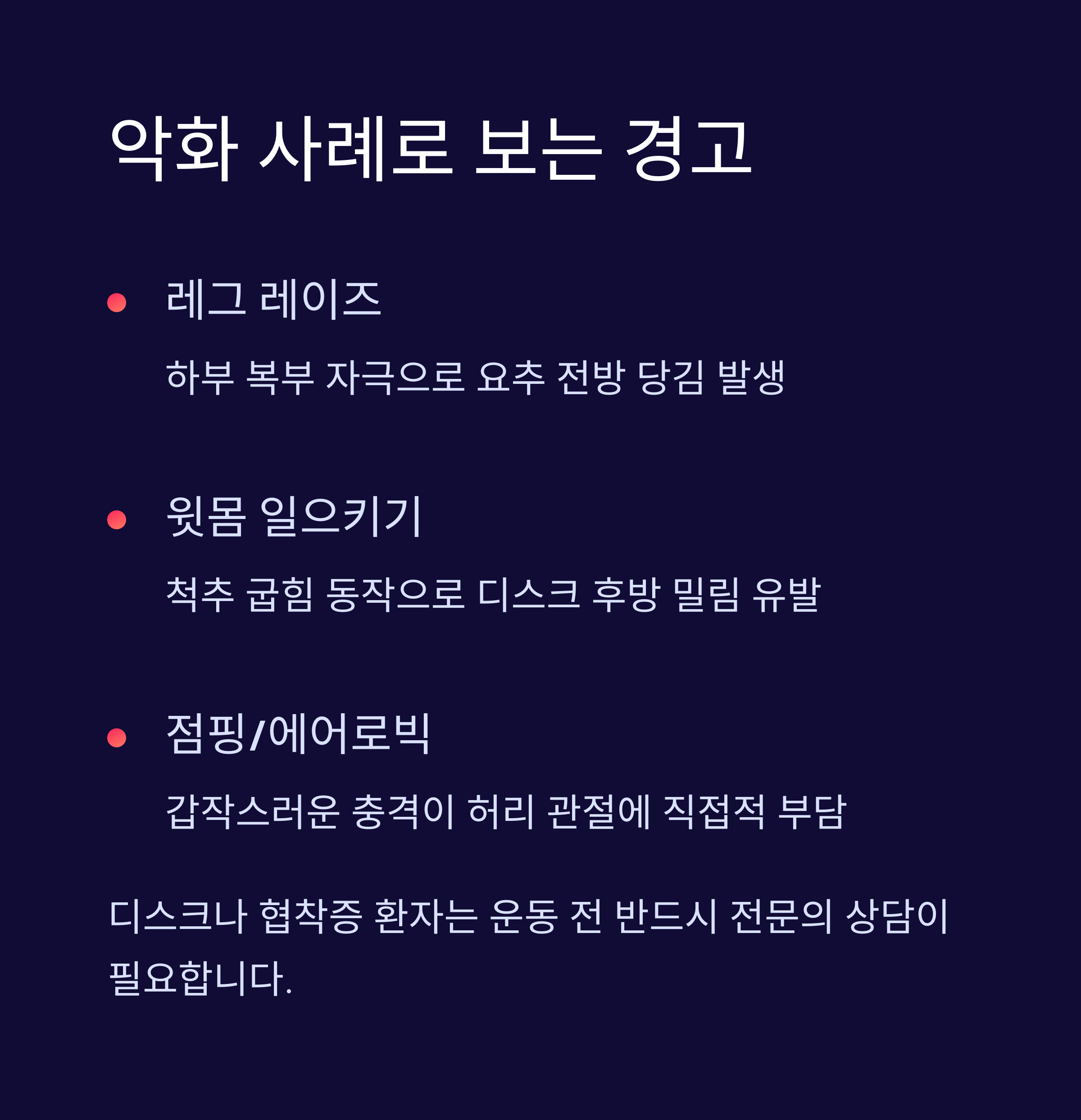| 윗몸 일으키기 | 악화 | 굽힘 동작으로 디스크 자극, 통증 유발 가능 |