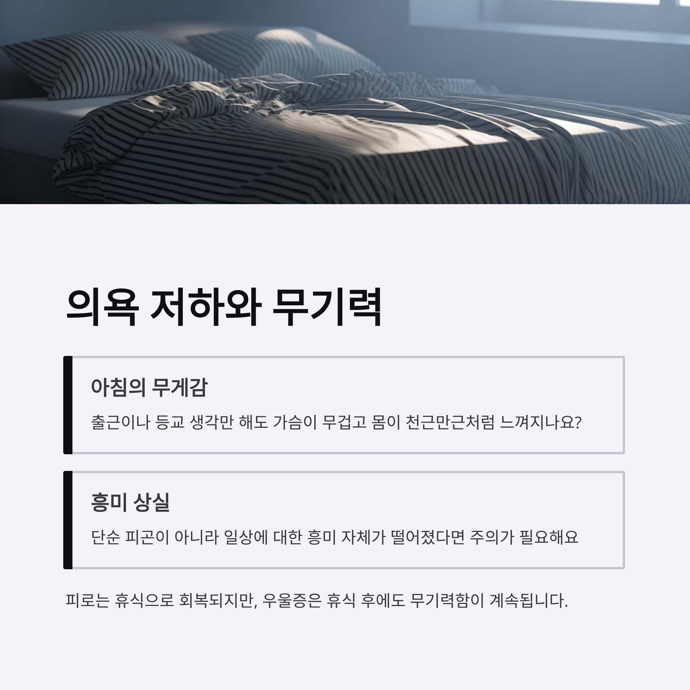 단순히 피곤해서가 아니라, 일상에 대한 흥미 자체가 떨어졌다면 우울증 초기일 수 있어요.