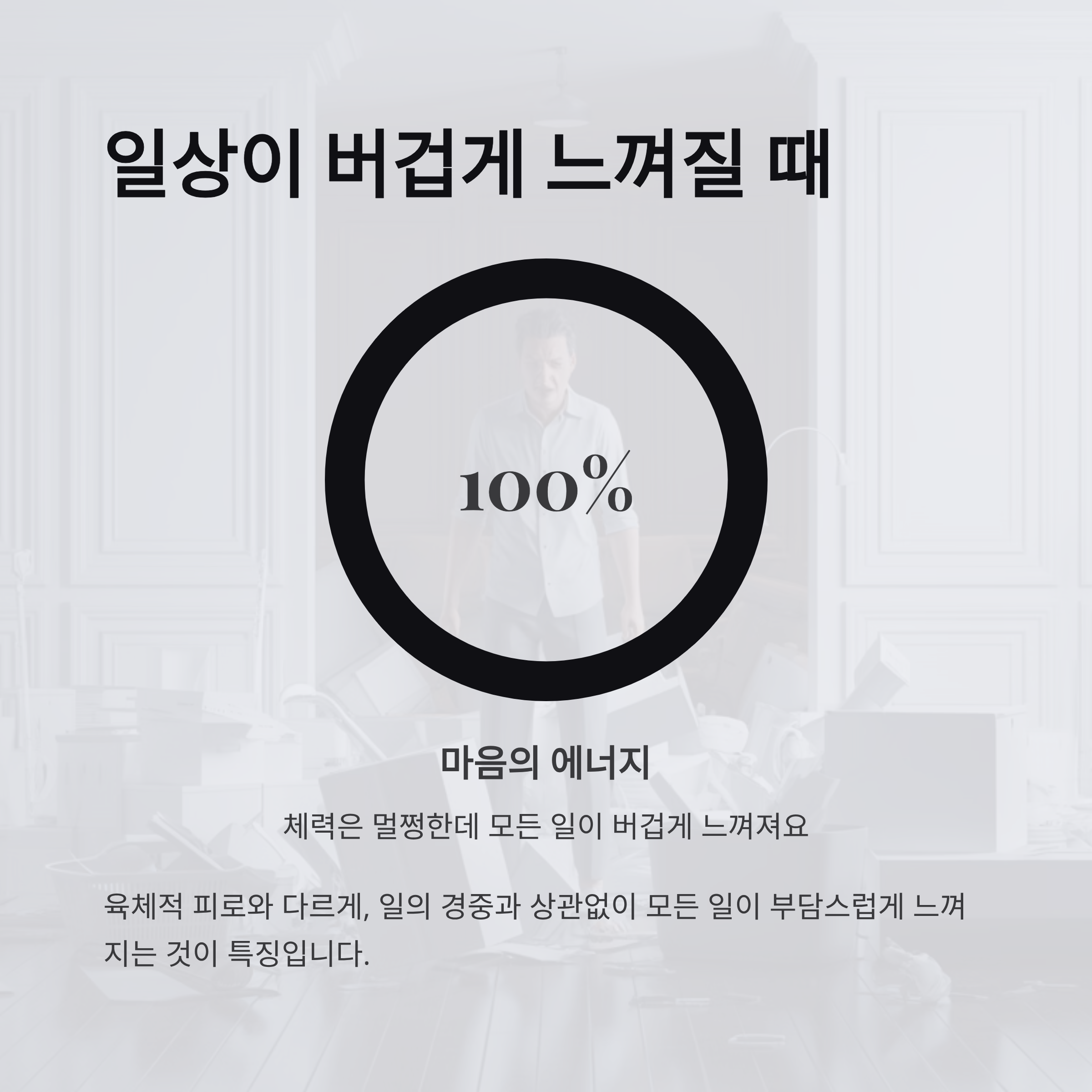 이럴 땐 육체적 피로와 다르게, 일의 경중과 상관없이 모든 일이 버겁게 느껴지는 것이 특징입니다.