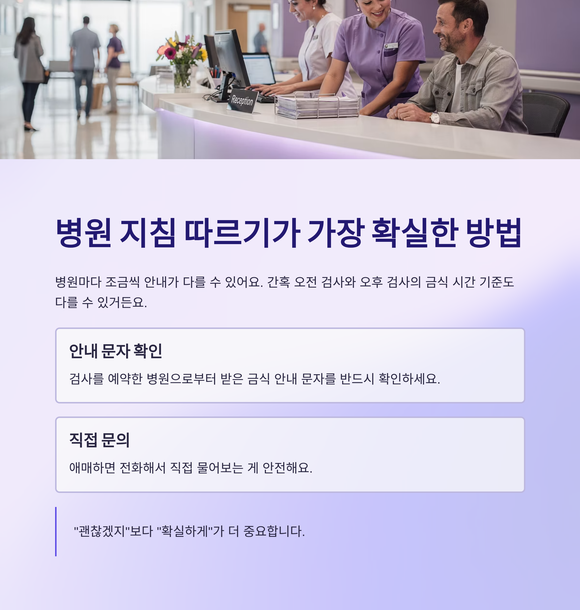 병원마다 조금씩 안내가 다를 수 있어요. 간혹 오전 검사와 오후 검사의 금식 시간 기준도 다를 수 있거든요.
