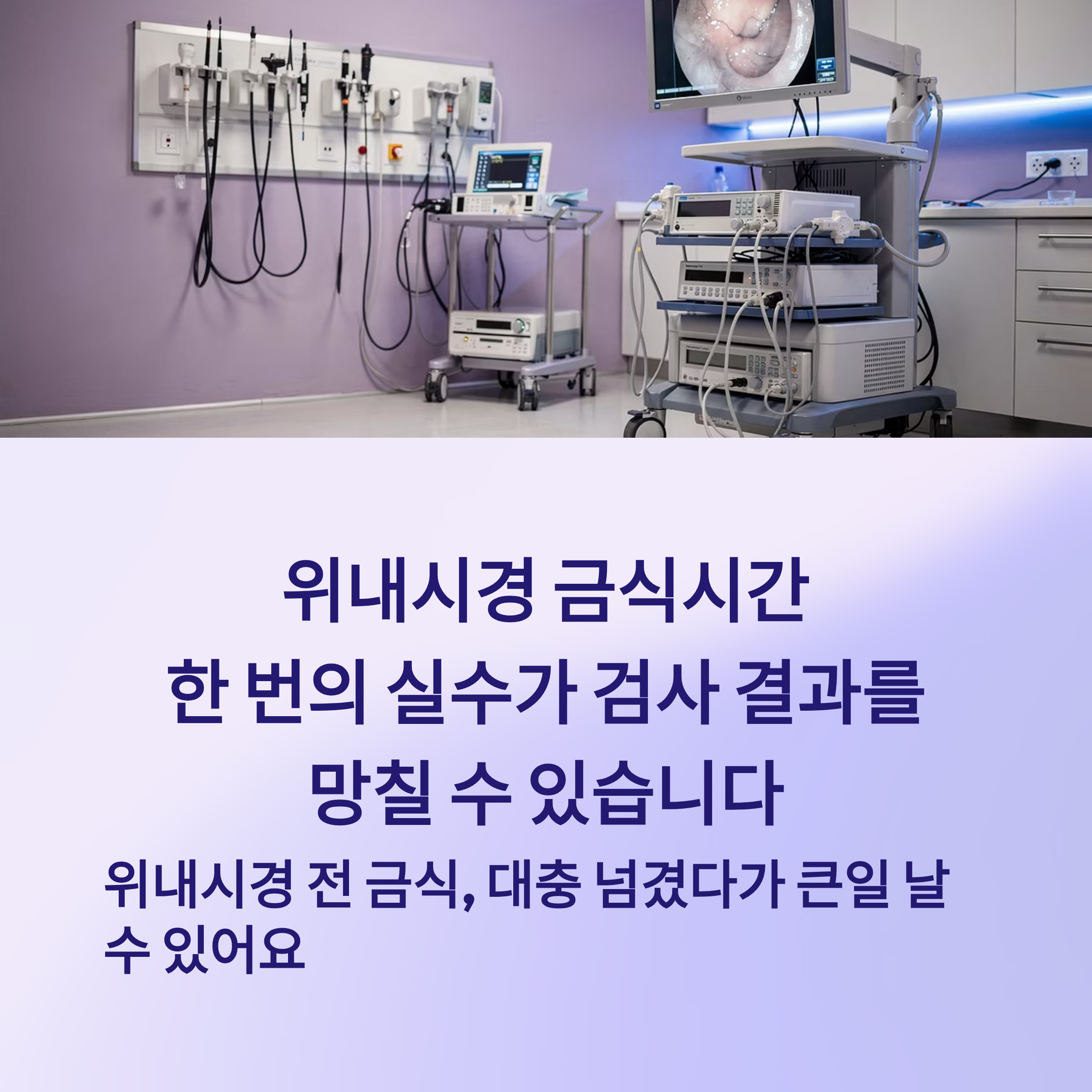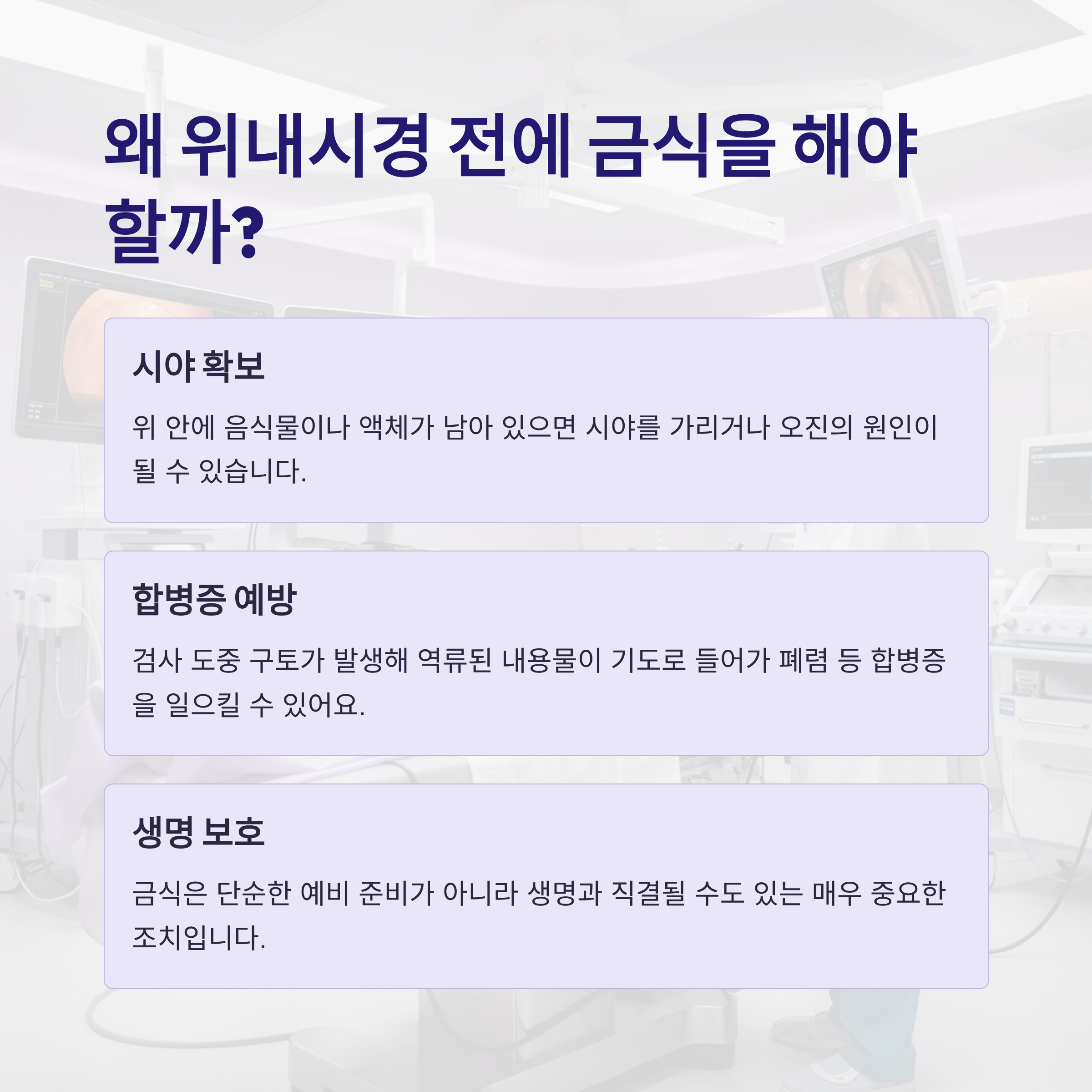 위내시경은 위 속 상태를 직접 관찰하는 검사예요. 위 안에 음식물이나 액체가 남아 있으면 시야를 가리거나 오진의 원인이 될 수 있습니다.