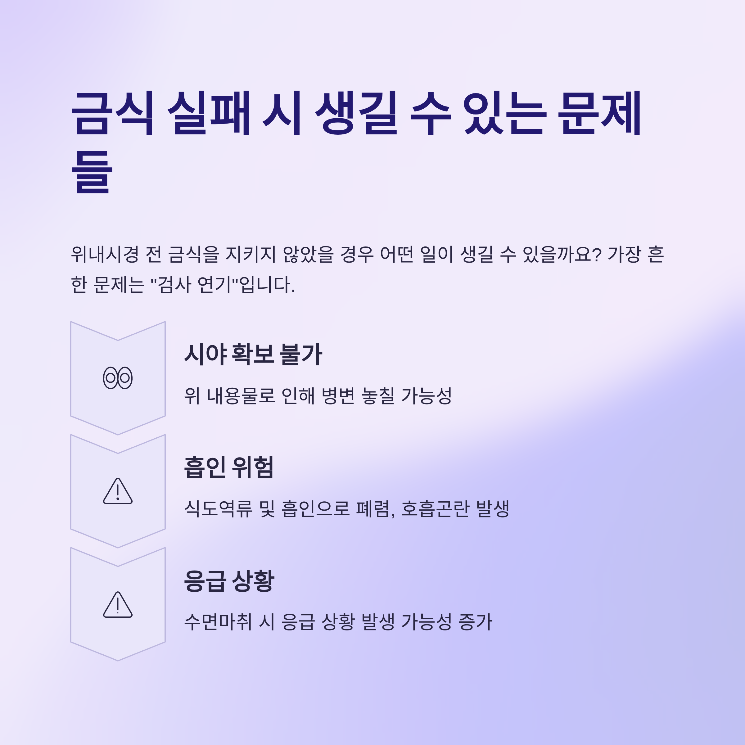 특히 수면내시경을 받을 경우, 내용물이 기도로 넘어갈 위험도 있으니 더 조심해야 합니다.