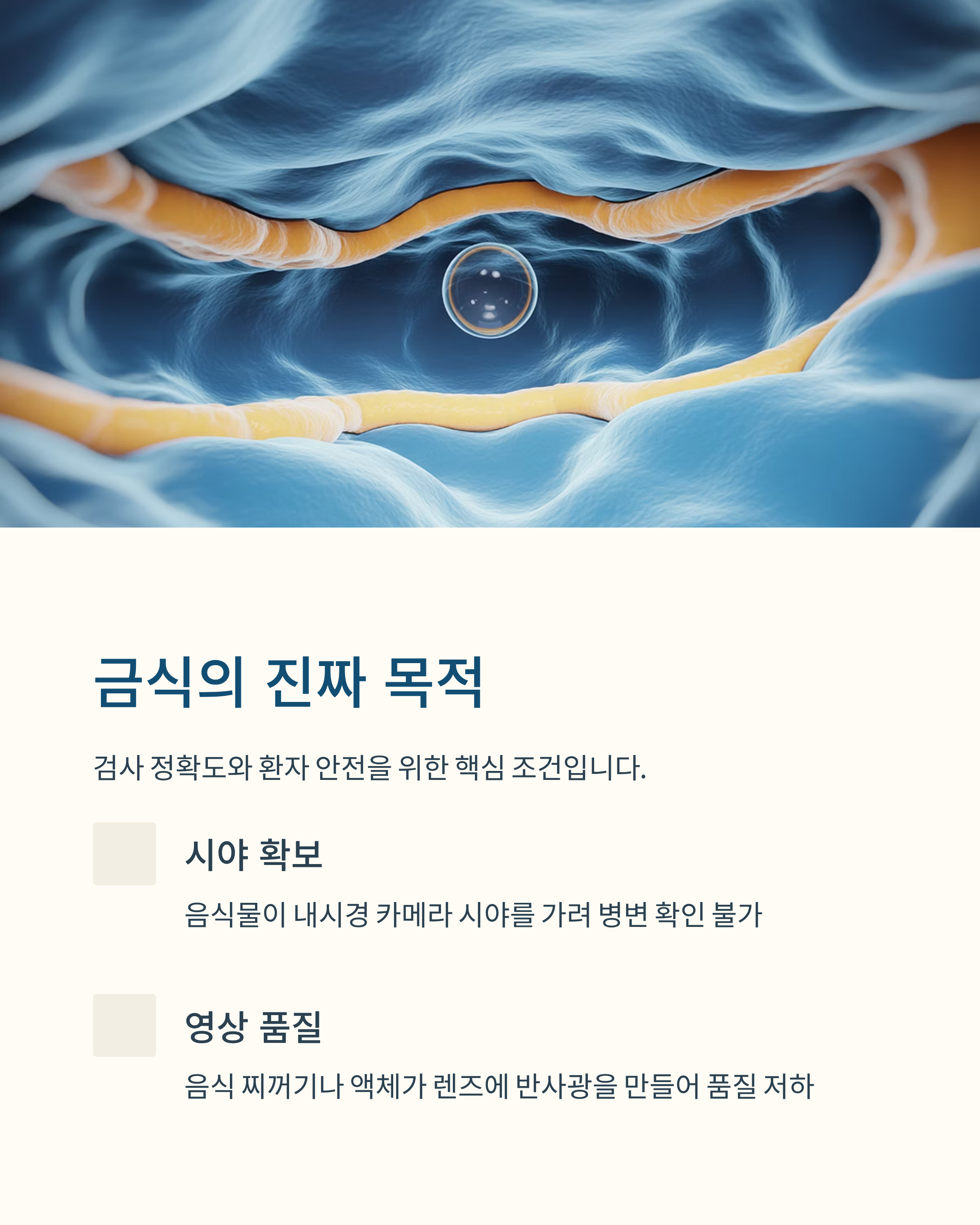 검사 전 금식은 단순한 절차가 아닌, 검사 정확도와 환자의 안전을 위한 핵심 조건입니다. 위에 음식물이 남아있을 경우, 내시경 카메라의 시야를 가려 병변을 제대로 확인할 수 없습니다. 특히 음식 찌꺼기나 액체는 내시경 렌즈에 반사광을 만들어 영상의 품질을 떨어뜨릴 수 있어요.