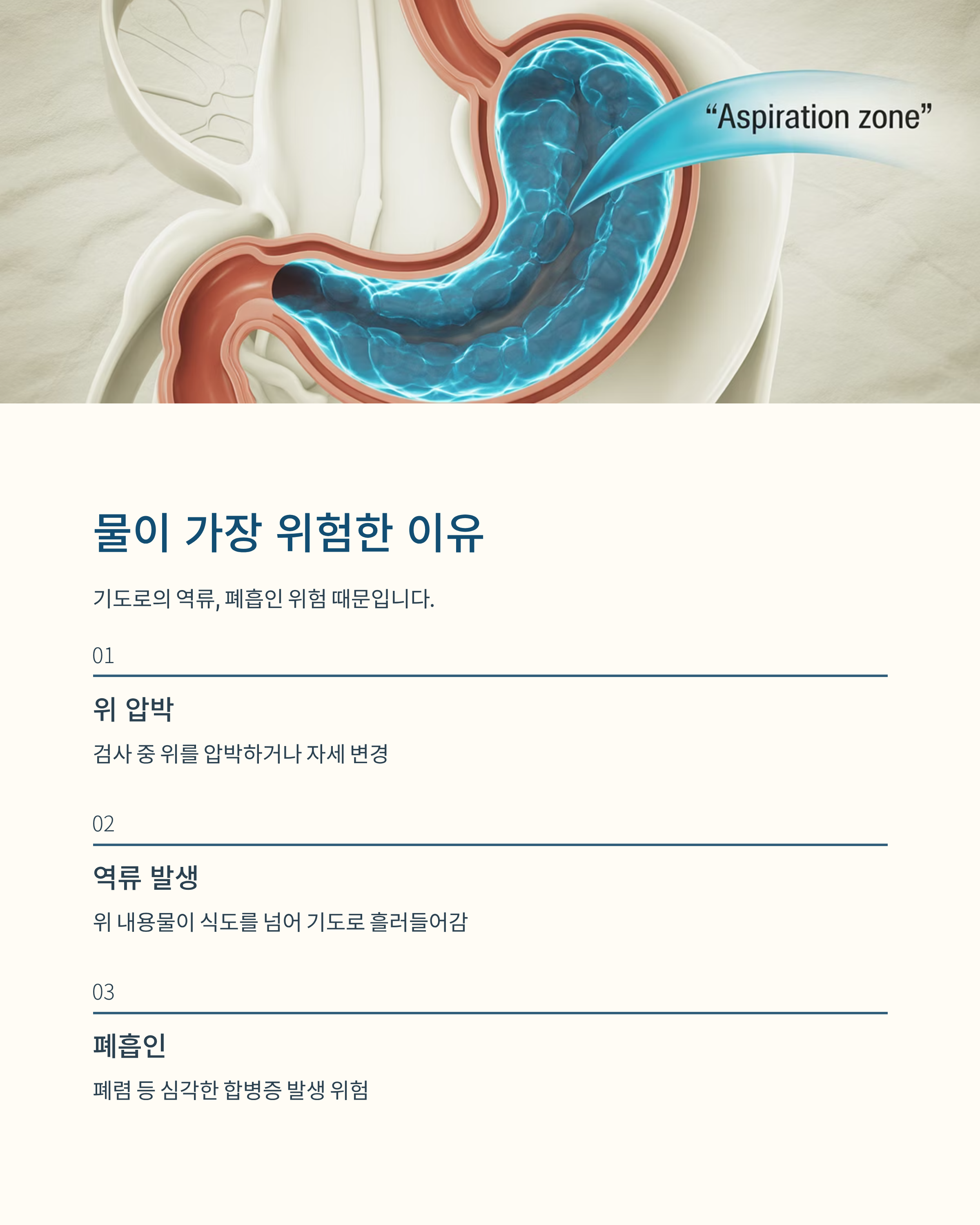 물이 남아 있는 위는 검사 도중 역류할 수 있습니다. 위를 압박하거나 자세를 변경하는 과정에서 위 내용물이 식도를 넘어 기도로 흘러들어가는 '폐흡인'이 발생할 수 있기 때문이죠. 이로 인해 폐렴 등의 합병증이 생길 위험이 있기 때문에, 검사 전엔 물도 삼가야 하는 겁니다.