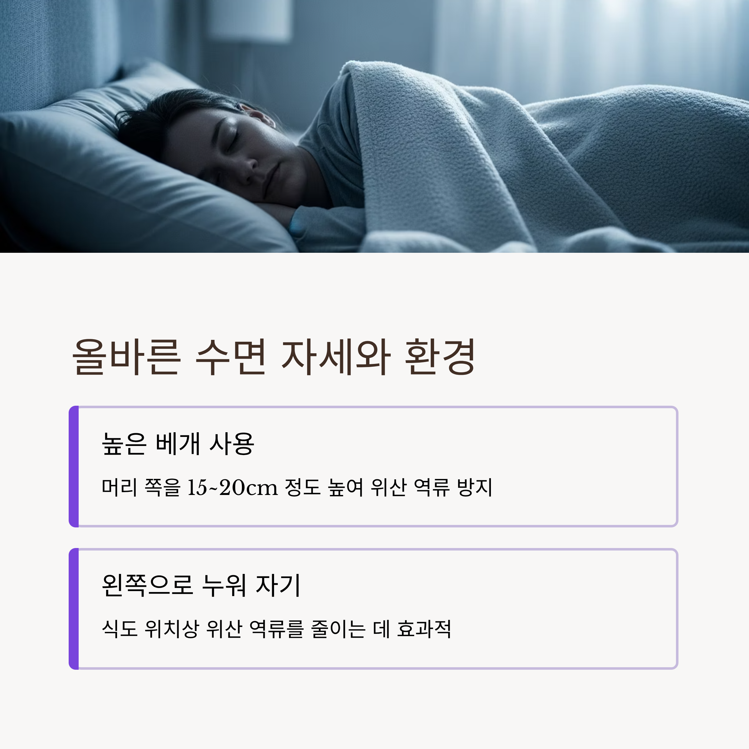 저녁 식사 이후 취침 시에는 머리 쪽을 약간 높게 하여 위산이 식도로 역류하는 것을 물리적으로 방지하는 것이 좋습니다. 침대 머리 부분을 약 15~20cm 정도 높이거나, 상체를 살짝 기울인 자세에서 수면을 취하는 것이 효과적입니다. 또한 왼쪽으로 누워 자는 자세는 식도의 위치상 위산 역류를 줄이는 데 도움이 됩니다.