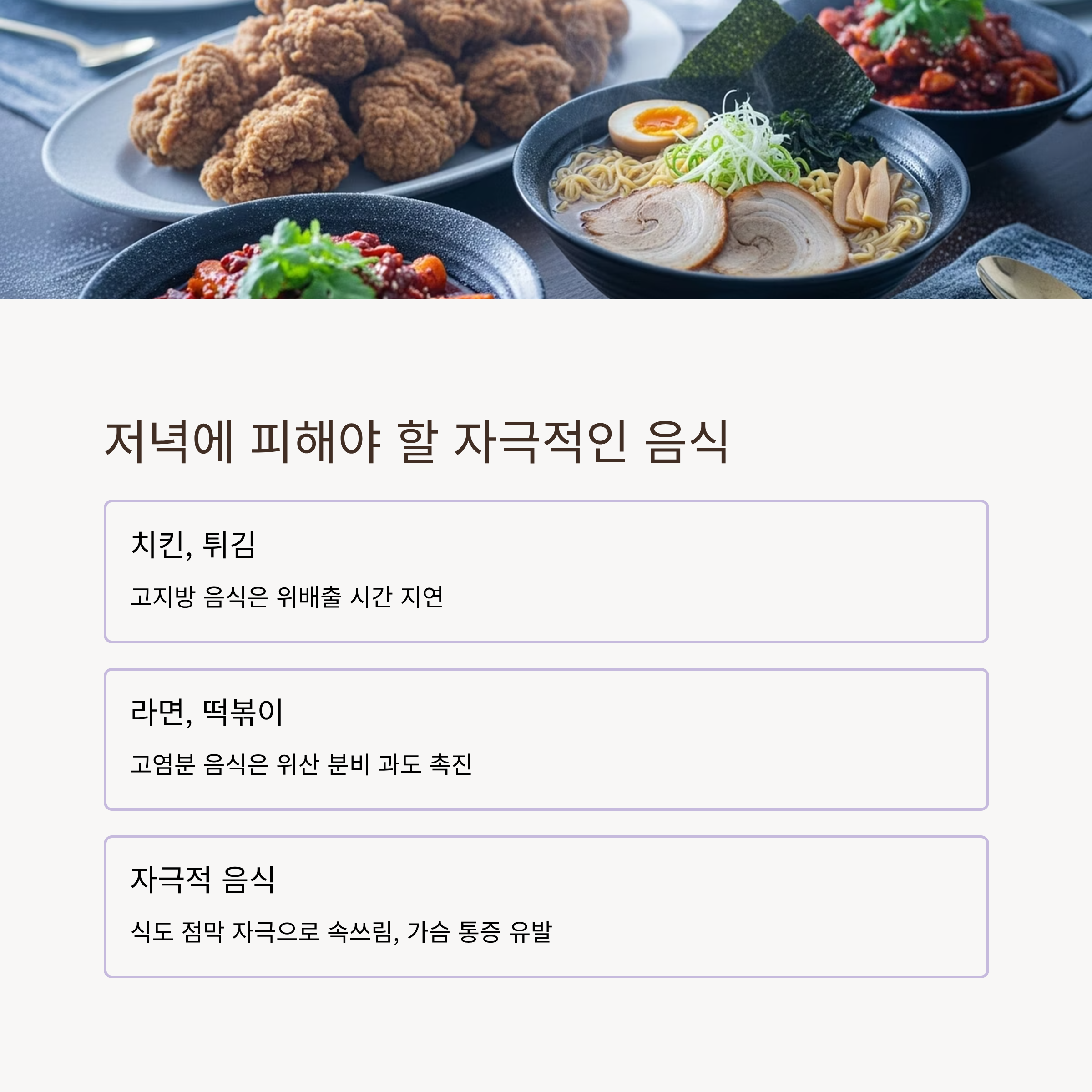 대표적으로 치킨, 라면, 튀김, 떡볶이 등 고지방·고염분 음식은 위배출 시간을 지연시키고 위산 분비를 과도하게 촉진합니다. 이는 식도 내 점막을 자극하여 속쓰림과 가슴 통증을 유발할 수 있습니다. 특히 야식으로 많이 섭취되는 라면은 포화지방과 나트륨이 다량 포함되어 있어 역류성 식도염 환자에게는 치명적입니다.