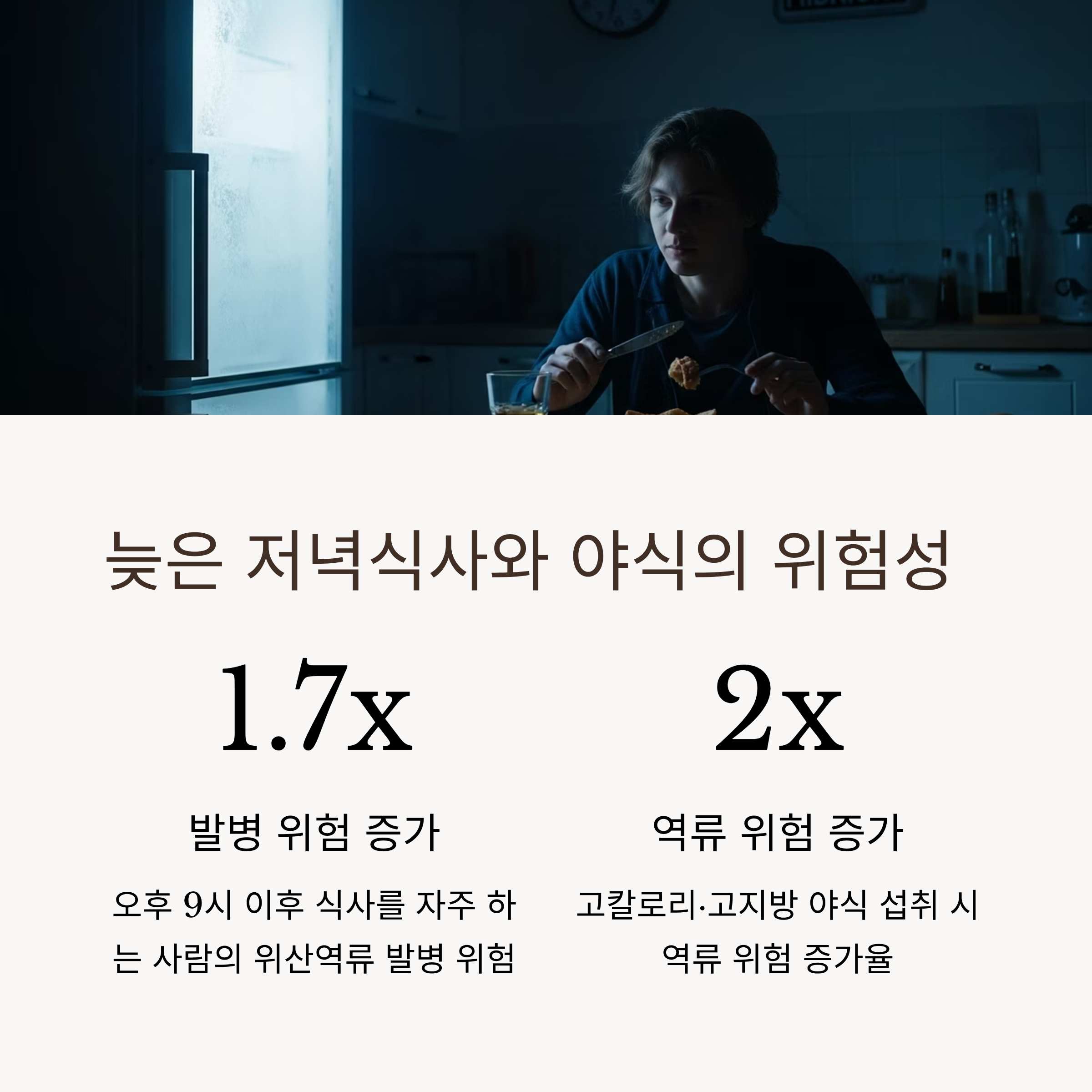 야식은 위산의 분비를 촉진하고 위장에 부담을 주며, 수면 중 역류를 유발할 확률을 높입니다. 특히 고칼로리·고지방 음식을 섭취할 경우 역류 위험은 최대 2배까지 증가할 수 있습니다. 한 연구에 따르면 오후 9시 이후 식사를 자주 하는 사람은 위산역류 증상이 없는 사람보다 발병 위험이 1.7배 높은 것으로 나타났습니다.