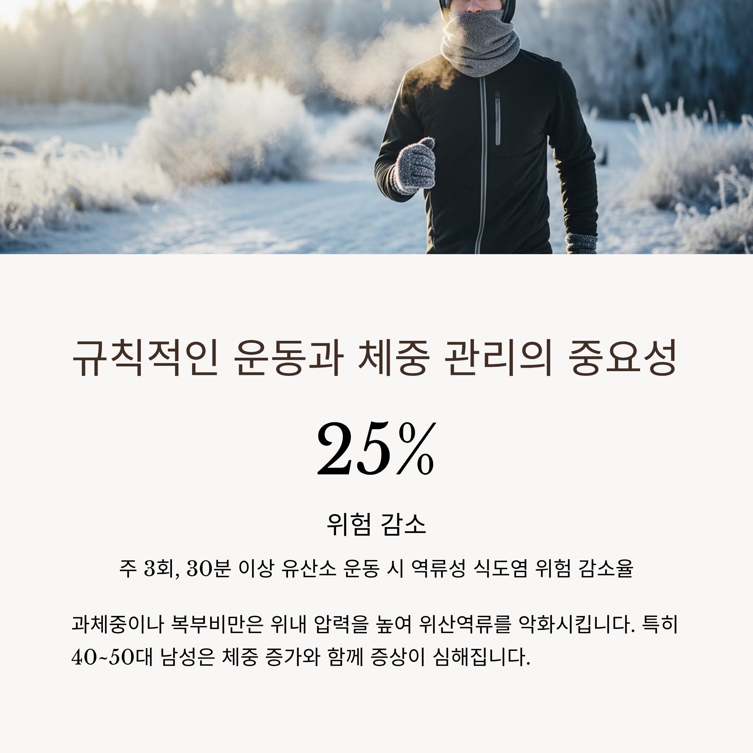 과체중 혹은 복부비만은 위내 압력을 높여 위산역류를 더욱 악화시킵니다. 특히 남성의 경우 40~50대에 접어들며 체중 증가가 본격화되면서 위산역류 증상도 함께 증가하는 경향이 있습니다. 일주일에 최소 3회, 30분 이상 유산소 운동을 실천하면 역류성 식도염 위험을 25% 이상 줄일 수 있다는 통계도 있습니다.