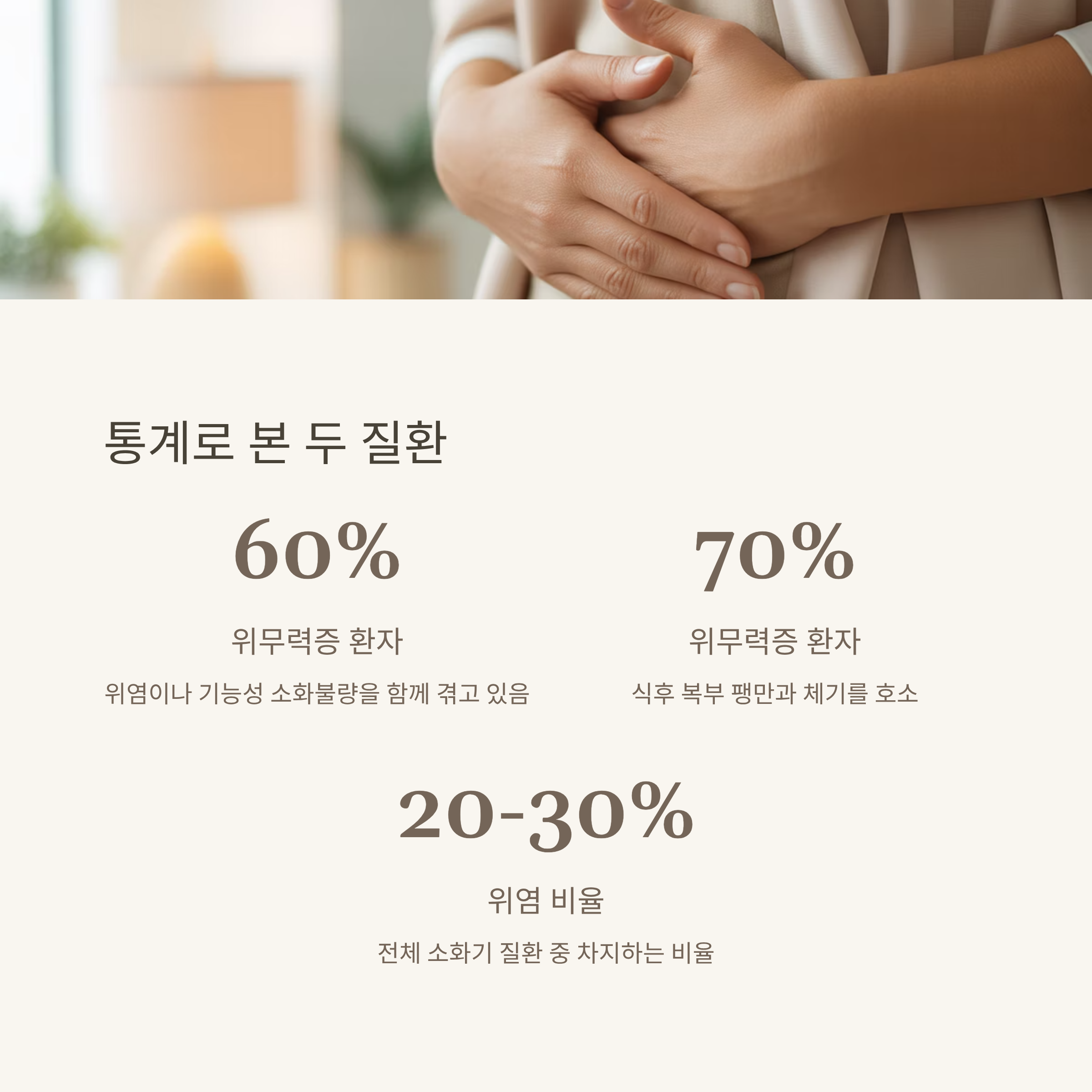 위무력증 환자 중 약 60%가 위염이나 기능성 소화불량을 함께 겪고 있다고 하며, 위무력증 환자의 70% 이상은 식후 복부 팽만과 체기를 호소합니다.