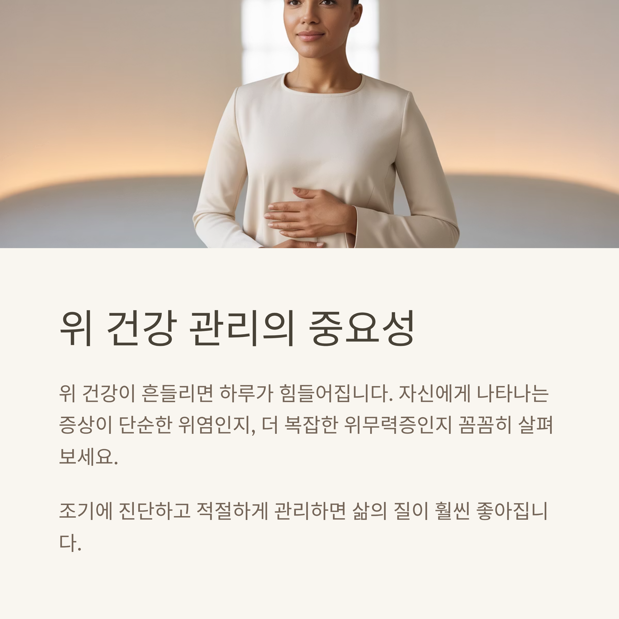 특히 위염은 염증성 질환이고 위무력증은 운동성 장애 질환이기 때문에 체중 변화나 복부 팽만, 식후 증상 지속 여부를 꼼꼼히 살펴보는 것이 중요합니다.