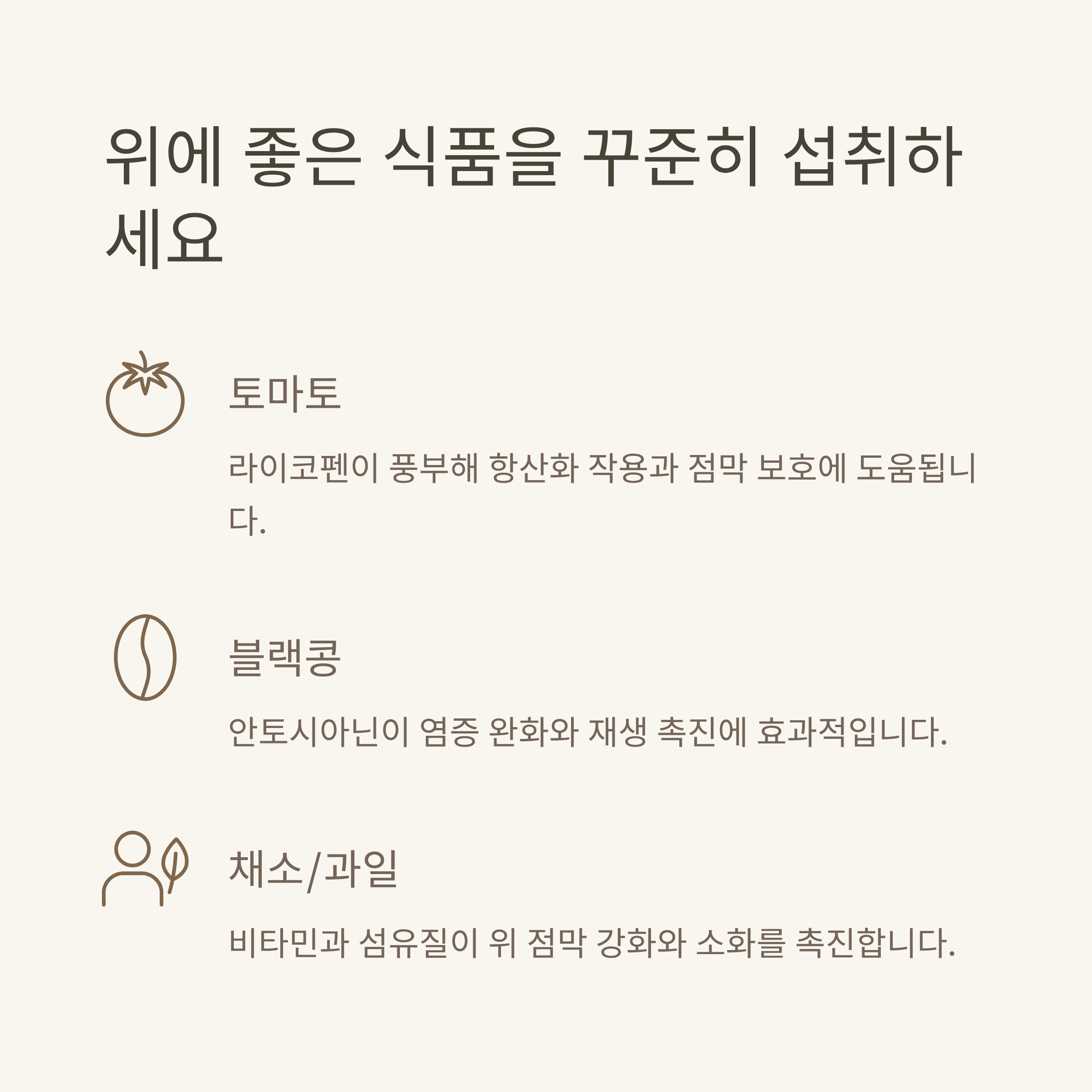 위 점막을 보호하고 회복을 돕는 비타민과 항산화 물질이 풍부한 음식이 도움됩니다.
