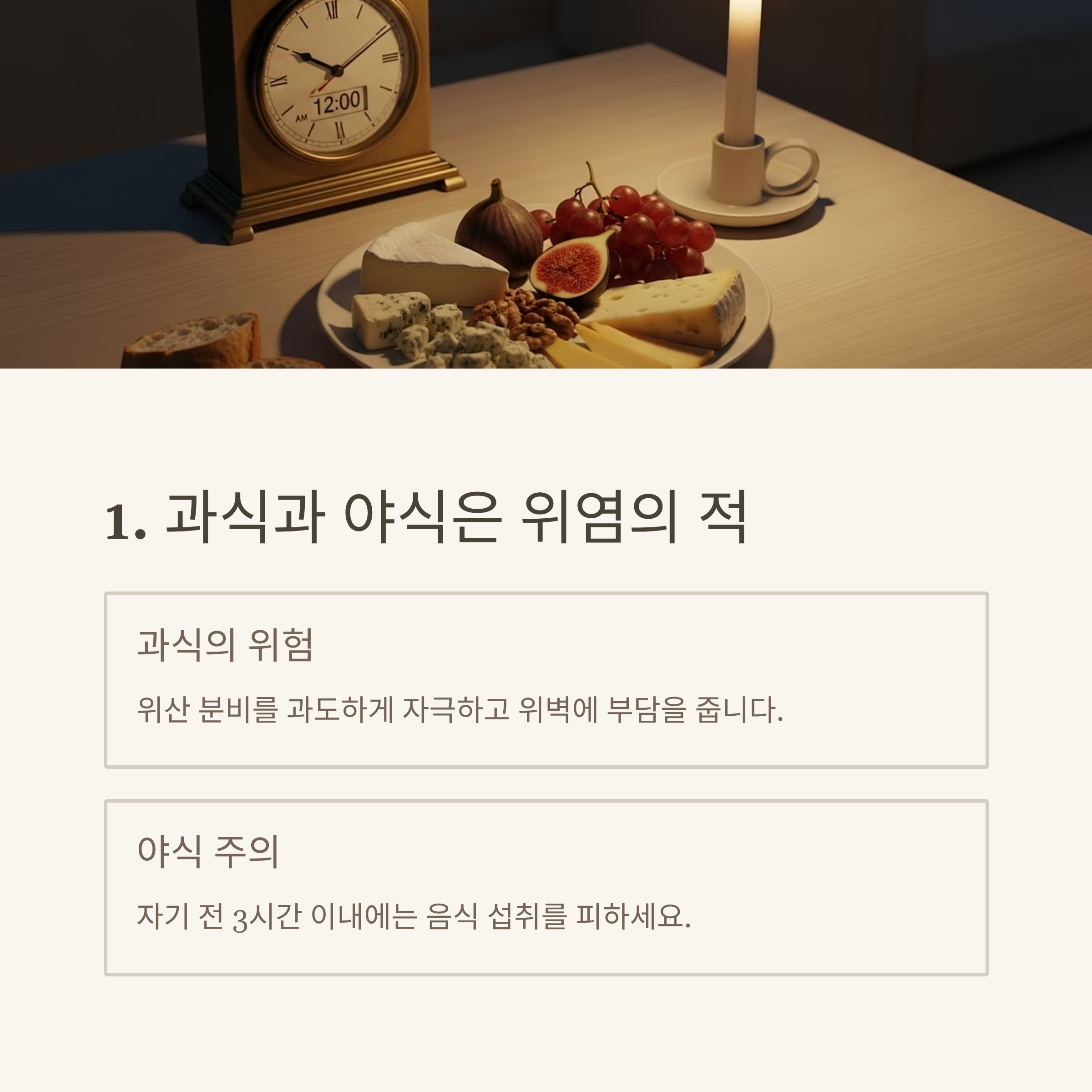 특히 늦은 밤의 야식은 음식물이 위에 오래 남아 위산 역류와 위벽 자극을 유발할 수 있어