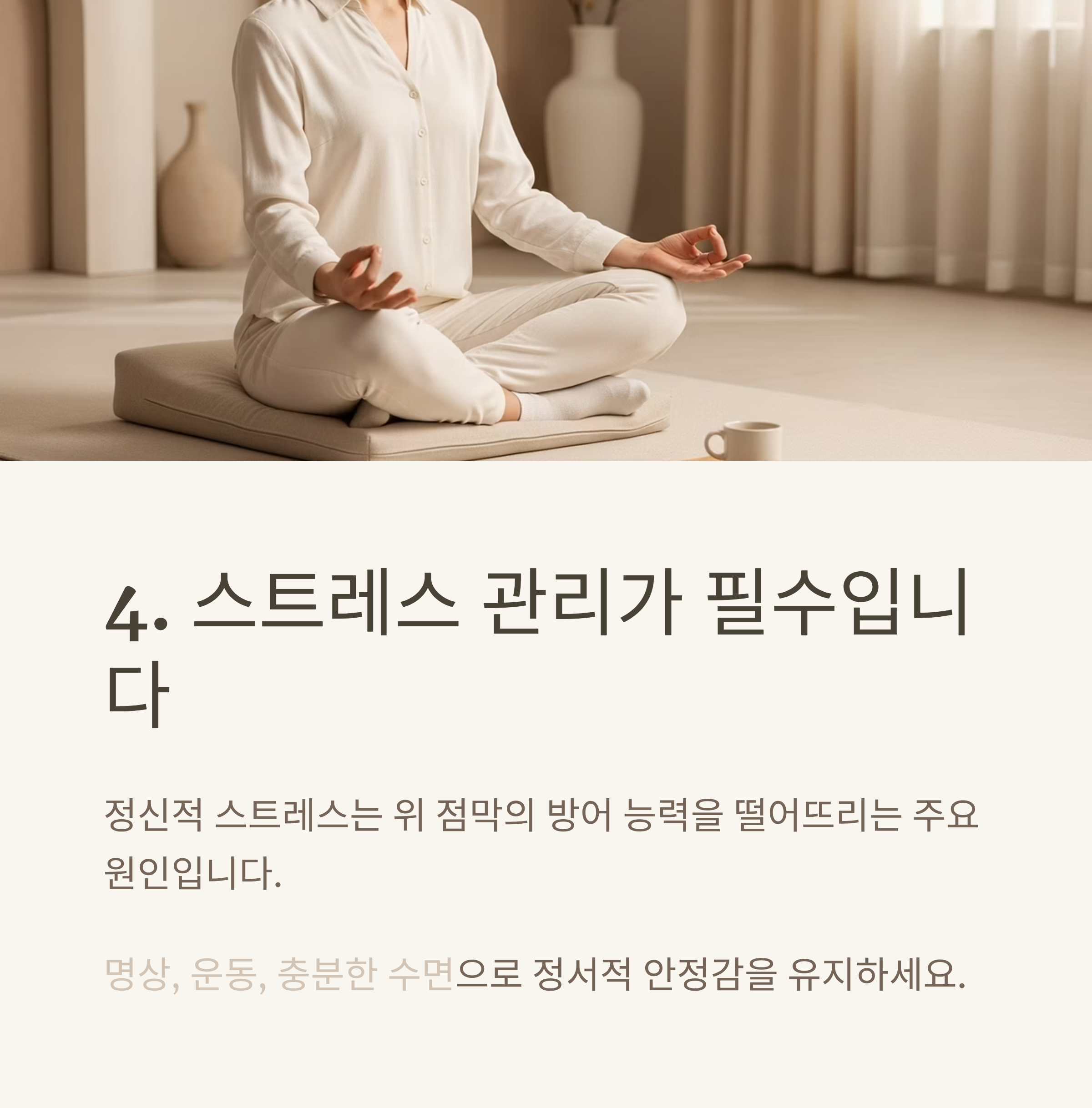 정신적인 스트레스는 위 점막의 방어 능력을 떨어뜨리는 주요 원인 중 하나입니다.
