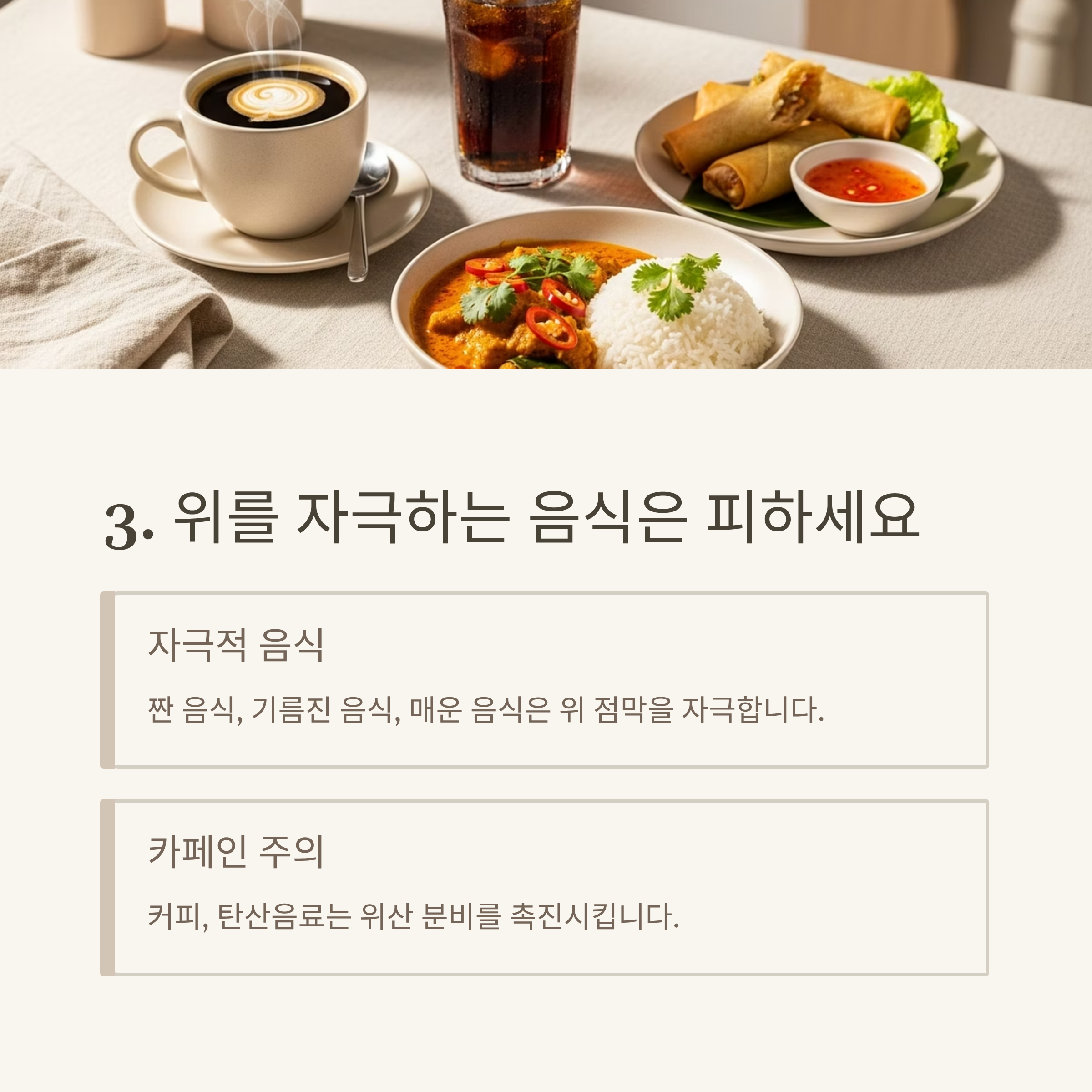특히 커피, 탄산음료, 고카페인 음료는 위산 분비를 촉진시켜 위염 재발의 원인이 됩니다.