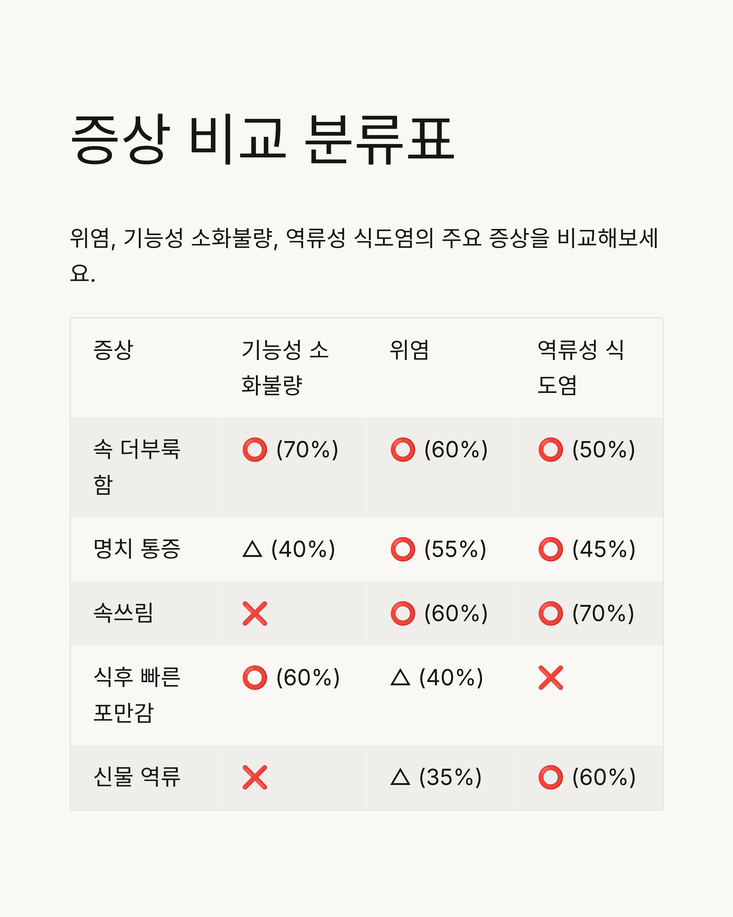 아래는 위염, 기능성 소화불량, 역류성 식도염의 주요 증상을 비교한 표입니다.