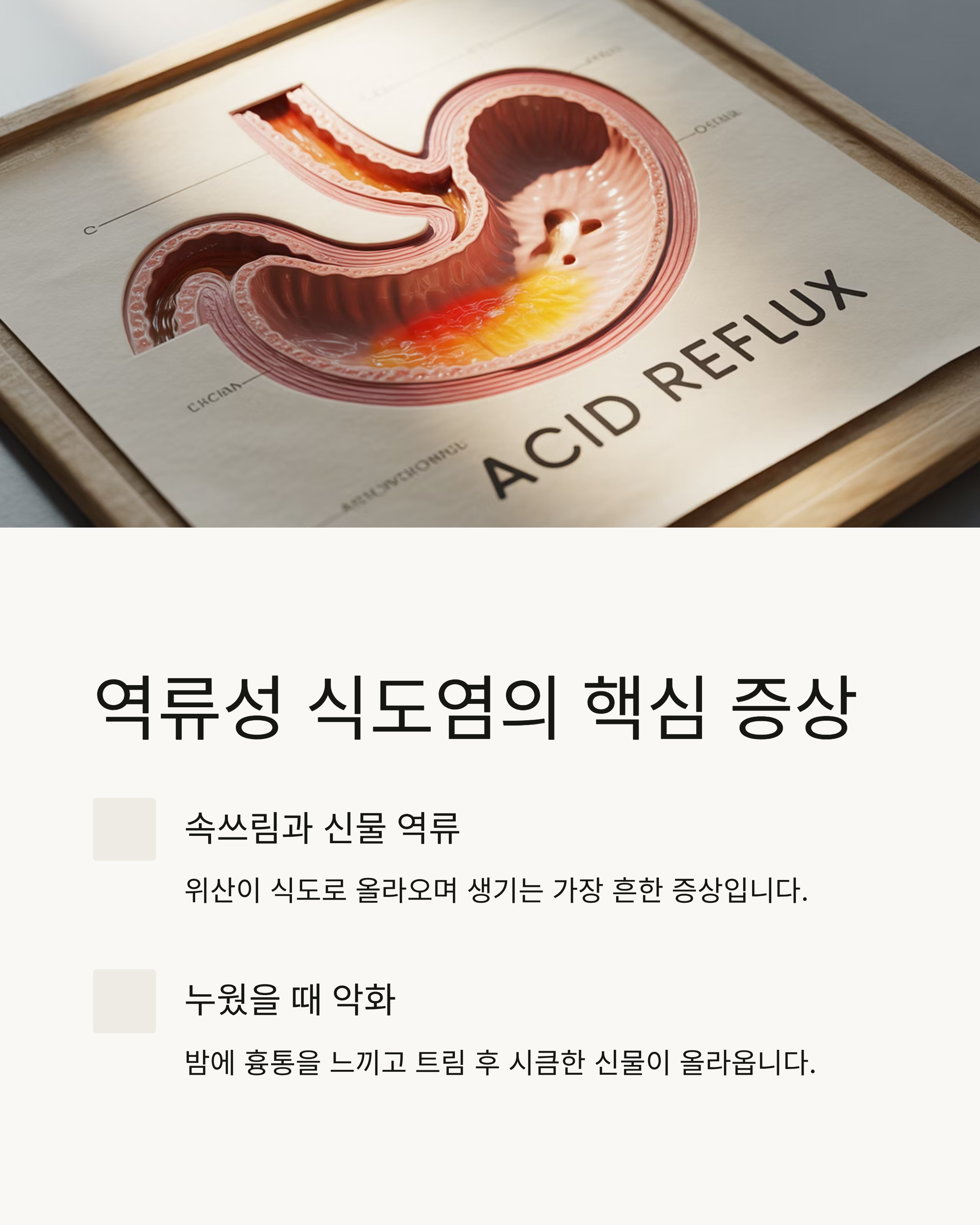 가장 흔한 증상은 "속쓰림"과 "신물 역류". 누웠을 때 증상이 심해지고, 밤에 흉통을 느끼기도 해요.