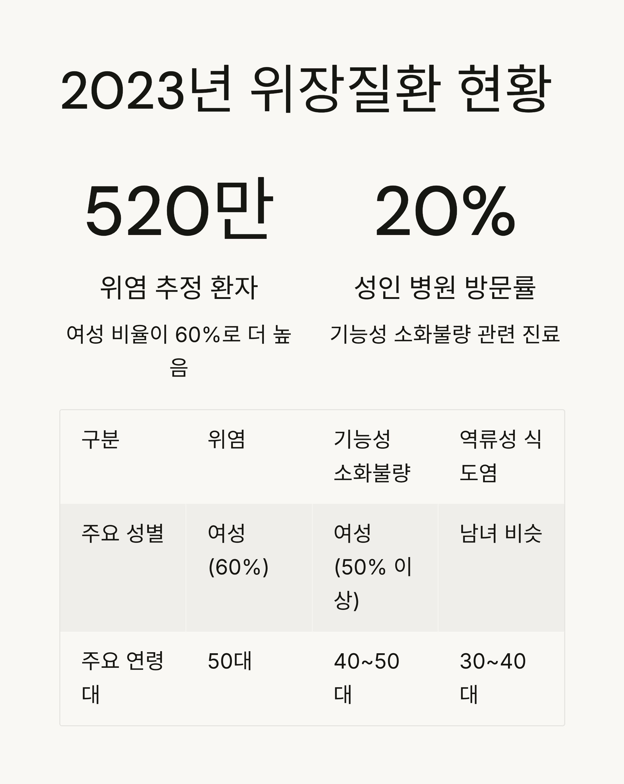 위염 추정 환자 수는 약 520만 명이며, 그중 여성 비율이 60%로 남성보다 많습니다.